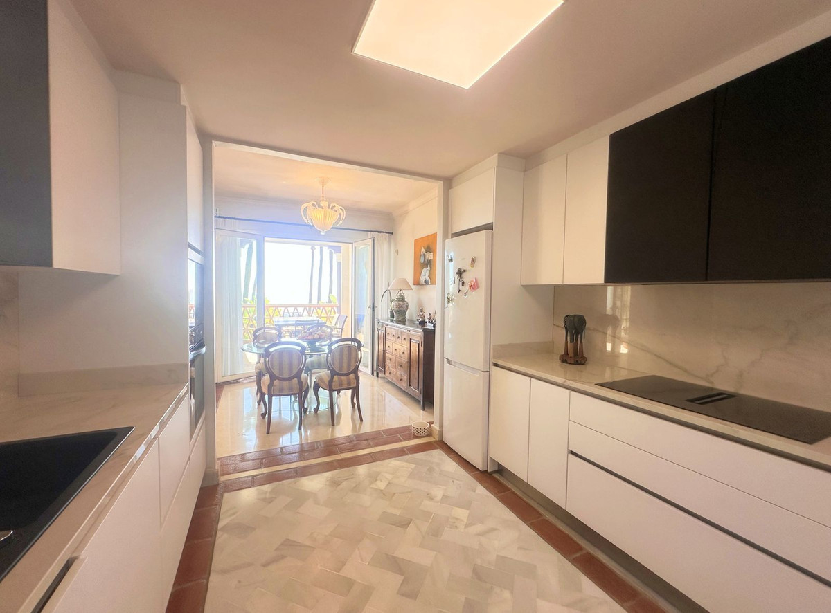 Luxury front line beach middle floor apartment. Located mid way between Estepona and the La Duquesa Marina, 5 minutes drive to all amenities and leisure areas, including excellent golf courses, one of them Finca Cortesín, home of the Volvo Masters.Only a few steps from magnificent beaches, restaurants and to a new beach club. 15 minutes walk through the prominade to the fishing village of Sabinillas. This property has just been recently reformed to a very high quality, magnificent kitchen with even coffee machine and wine cellar integrated, beautifull design living room, new a/c, etc. The property is south facing and enjoy stunning views to the Mediterranean Sea, Gibraltar and coast of Africa. Immaculate and quiet gated development with 24 hours security, with large gardens of beautiful features and fountains, 4 swiming pools, 2 of them heated. Great rental potential! Parking and storage room with an easy access with lift. Viewing is highly recommended!! JUST IN THE MARKET.