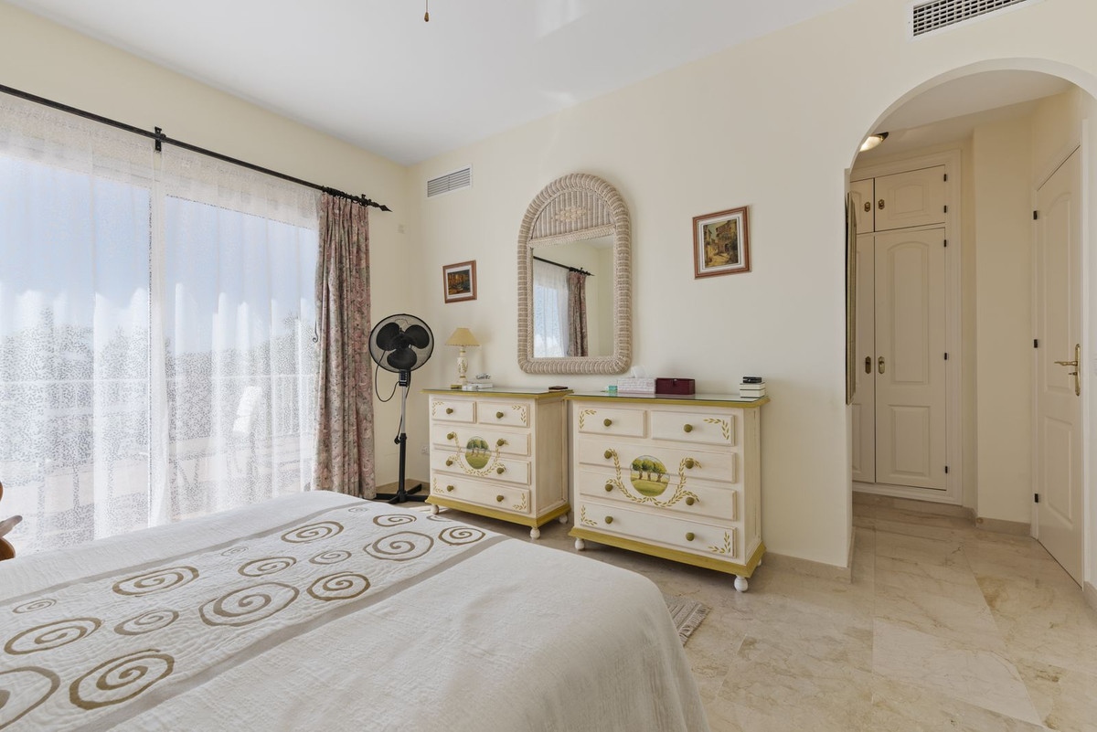 This beautiful 3 bedroom 2 bathroom penthouse nestled in the heart of Nueva Andalucia must be seen. With an expansive terrace and solarium totally nearly 100 sqm means there is a multitude of outdoor spaces to relax with incredible views of the surrounding areas and the iconic La Concha mountain. The main living area and 3 bedrooms are located on the main floor with a great sized balcony over looking the manicured gardens and 2 pools. This balcony gives direct access via an external staircase that has a huge solarium with built in bbq and 360degree views.