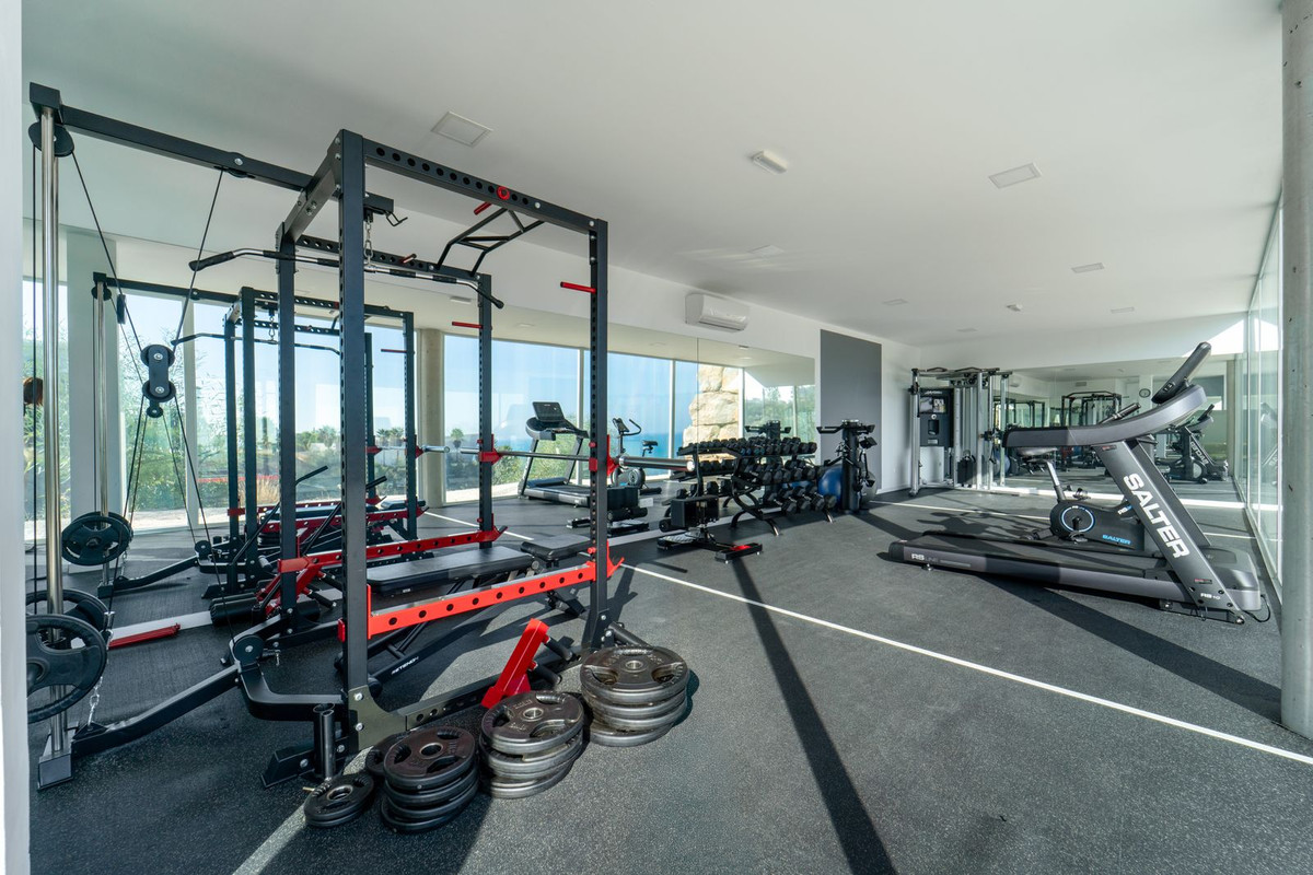 The perfectly designed penthouse offers three spacious bedrooms, all featuring built-in wardrobes and electric blinds on the windows. The main bedroom boasts an en-suite bathroom with double sink and a tiled walk-in shower with a rain shower head. The other two bedrooms share a second bathroom, also with a walk-in shower. In addition, there is a laundry room with additional storage space and a washer/dryer, underfloor heating throughout all the apartment, centralized air conditioning hot/cold, and an additional 2 water filters installed.