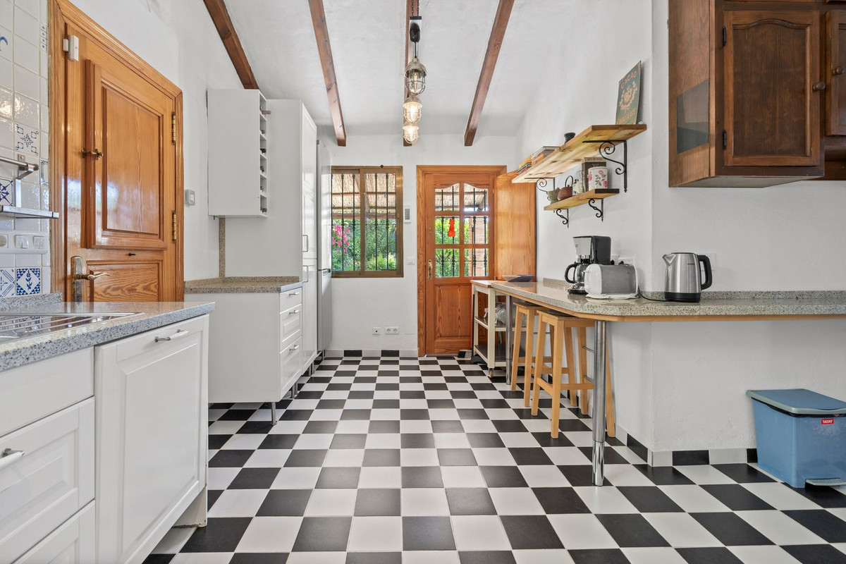 Cette villa de plain-pied, à l'agencement pratique et fluide, conserve le charme authentique d'une maison de campagne. Des détails tels que des plafonds voûtés et à poutres apparentes, des pierres rustiques et du fer forgé décoratif apportent chaleur et personnalité. Une suite d'invités séparée, accessible par un escalier extérieur depuis le patio, assure l'intimité des visiteurs. L'élégante allée, les oliviers, les points d'eau et le verger créent l'atmosphère d'une finca miniature.