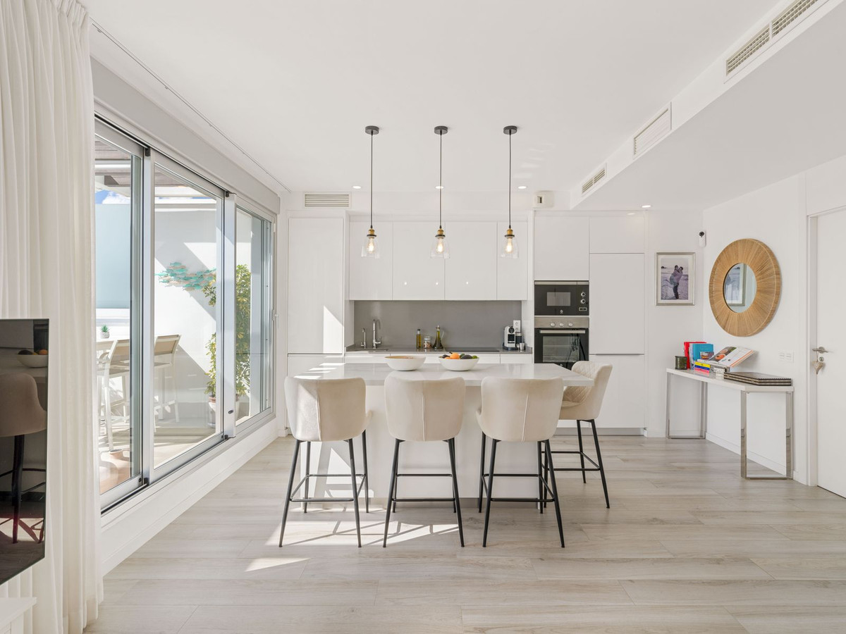 L'appartement lui-même est bien aménagé avec une cuisine ouverte avec bar à petit-déjeuner et coin salon, le tout donnant accès à la terrasse avec coin repas et salon.