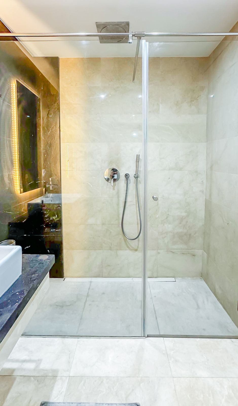 À l'intérieur, les deux salles de bains bénéficient de finitions haut de gamme avec chauffage au sol, tandis que la cuisine est entièrement équipée d'électroménagers haut de gamme. L'appartement regorge de détails soignés : stores électriques, finitions en bois et pierre de qualité supérieure, et matériaux muraux soigneusement choisis pour un confort optimal et une acoustique optimale. Une buanderie séparée ajoute une touche pratique.