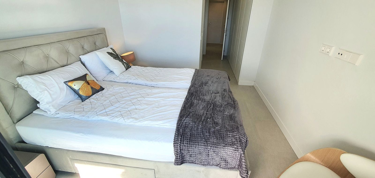 La chambre principale bénéficie également d'une vue sur la mer, d'un grand dressing et d'une élégante salle de bains attenante. Deux autres chambres doubles lumineuses et spacieuses disposent de placards intégrés et offrent une vue sur la piscine, les collines environnantes et le golf. Une salle de bains d'invités avec baignoire/douche complète l'hébergement.