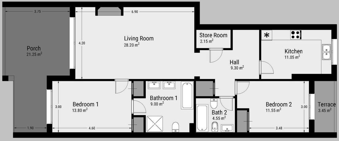 Inside, the apartment offers a bright, spacious living area with a cozy fireplace, two comfortable bedrooms, two bathrooms with underfloor heating, and a well-equipped kitchen with breakfast area. Its elevated position ensures privacy, tranquility, and uninterrupted views, making it a perfect permanent home or holiday retreat.