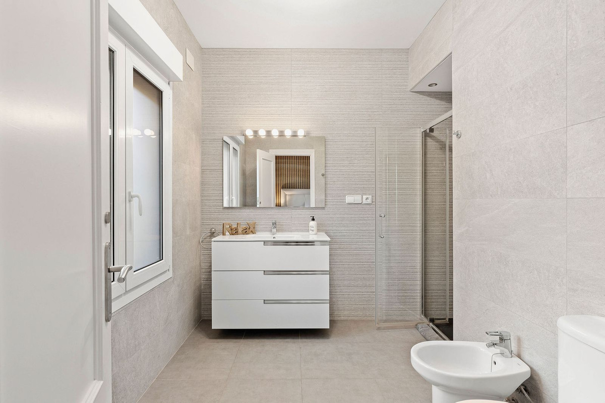 As you enter the villa you have a spacious living room leading in to the kitchen and diningroom. On this level you will also find the master bedroom en suite plus a guest bedroom with a separate bathroom.