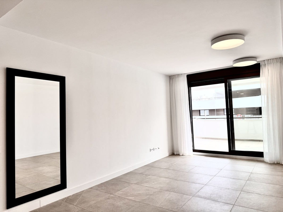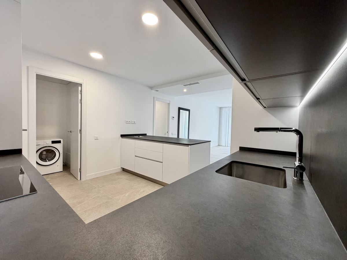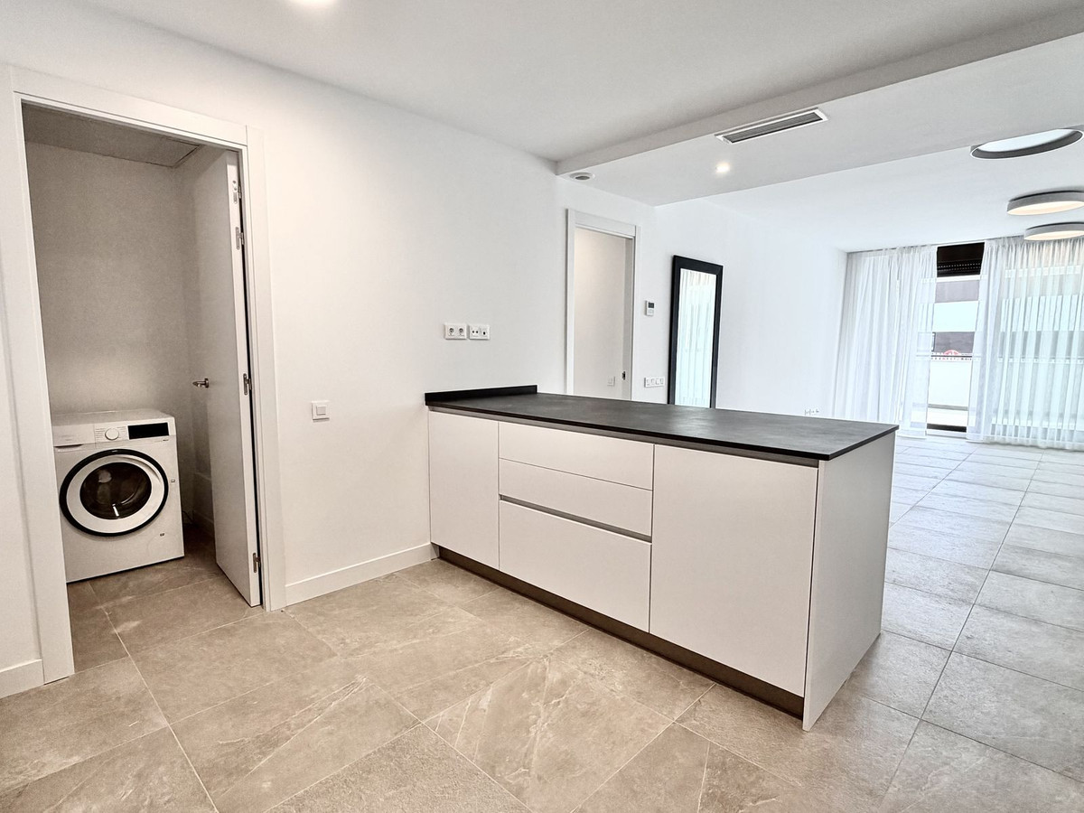 Le salon ouvert avec une cuisine moderne s'ouvre sur une spacieuse terrasse privée, parfaite pour profiter du style de vie méditerranéen.