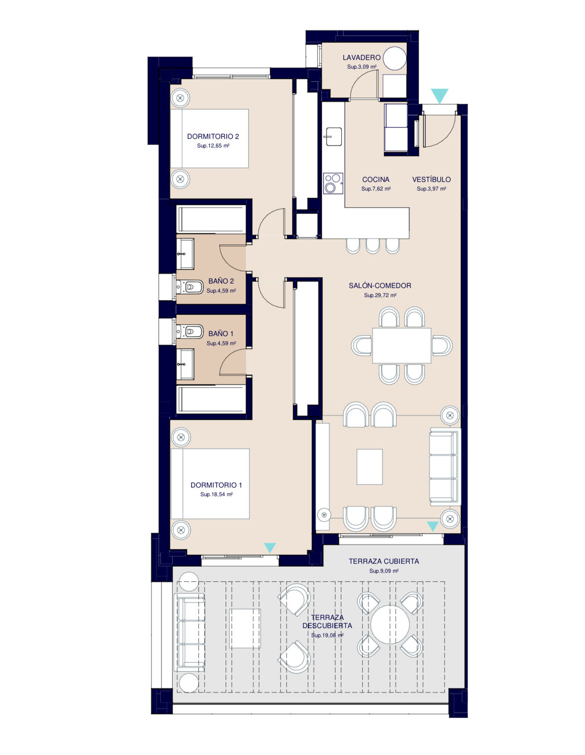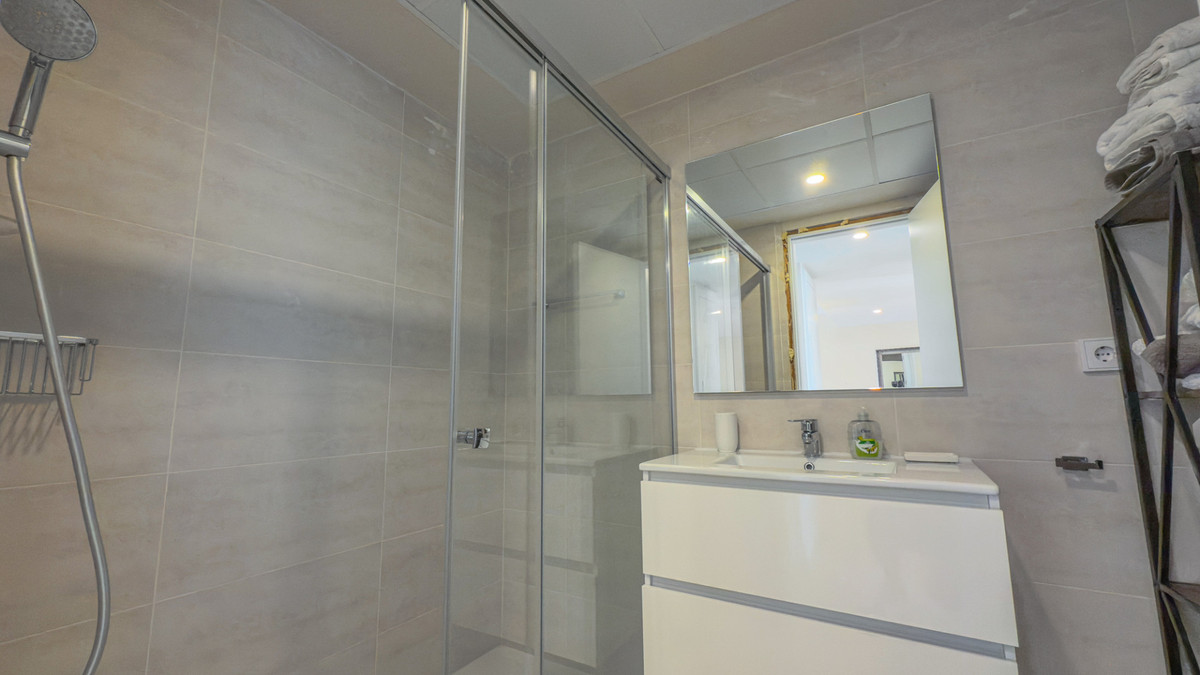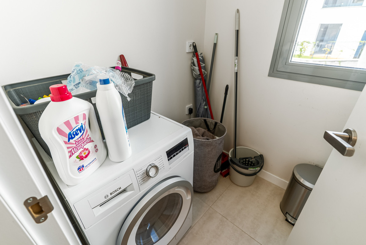 Les finitions et les matériaux de l'appartement reflètent une qualité supérieure, avec des sols en grès cérame, une menuiserie laquée blanche, une climatisation canalisée chaude et froide, un système aérothermique économe en énergie et de spacieuses armoires encastrées.