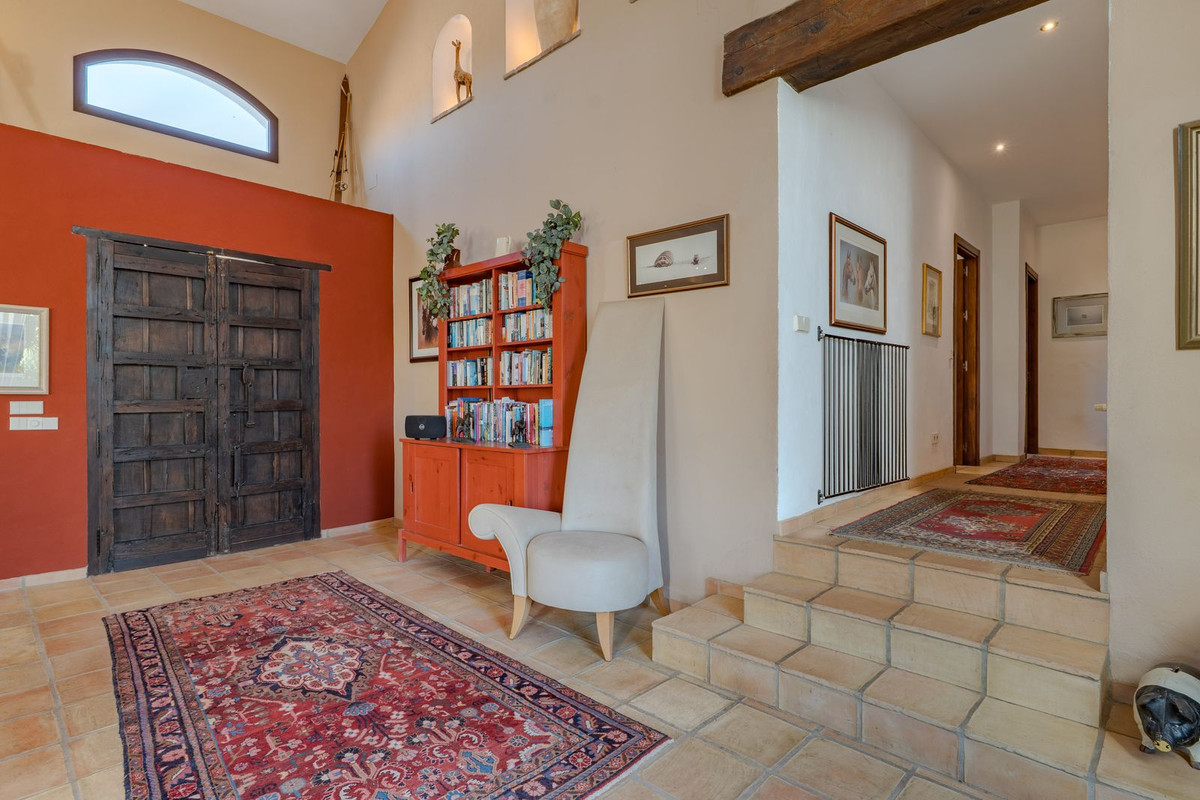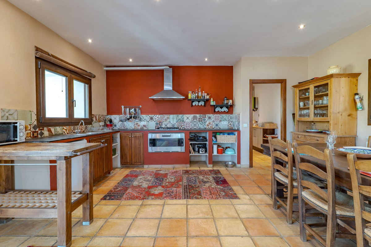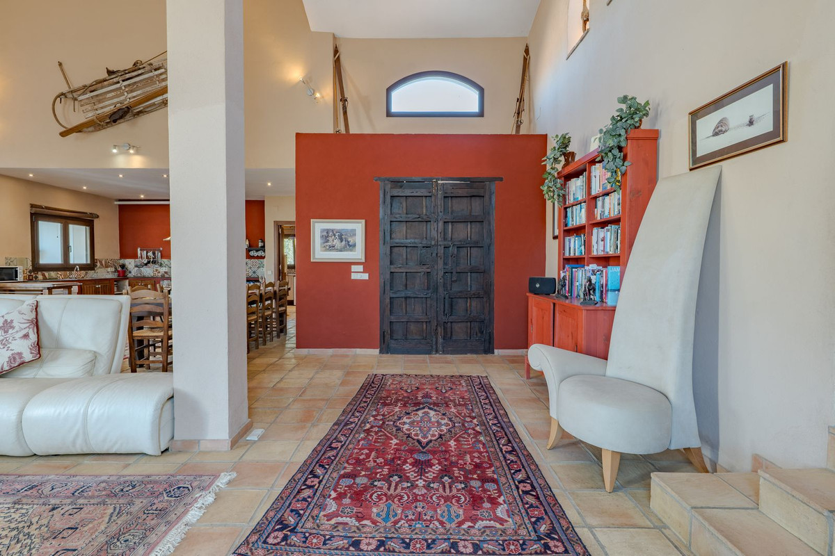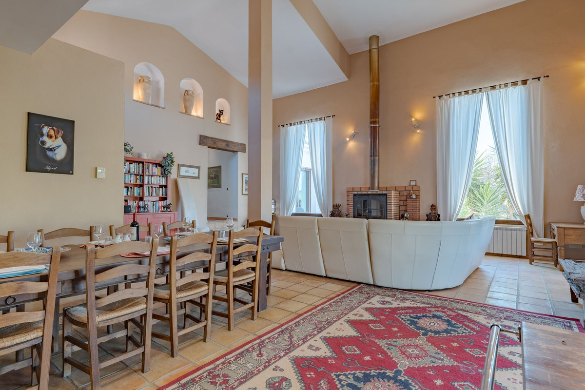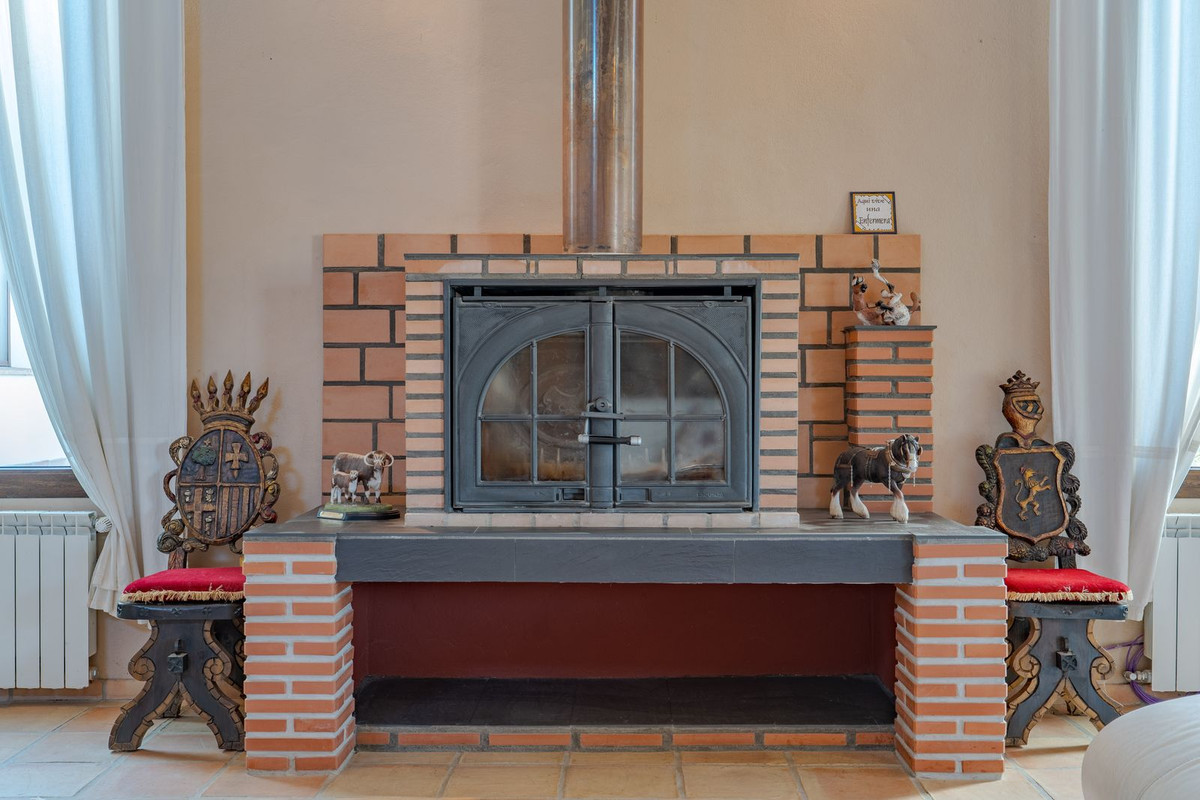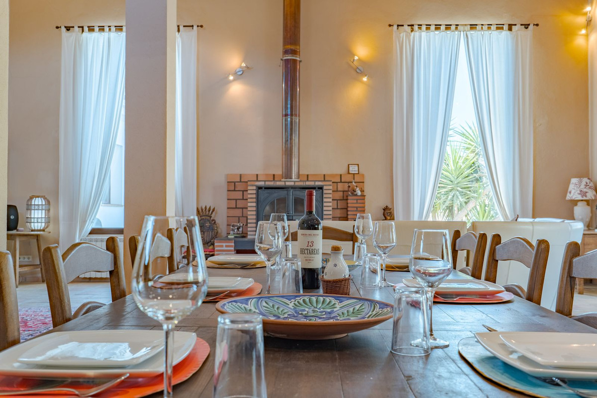 Hauts plafonds et grandes fenêtres : ces éléments architecturaux offrent un maximum de lumière naturelle tout au long de la journée et accentuent la sensation d'espace. Profitez de la chaleur de la cheminée lors des soirées plus fraîches, entourée de charmants sols en terre cuite et de la belle porte d'entrée en bois espagnol qui souligne l'atmosphère champêtre.