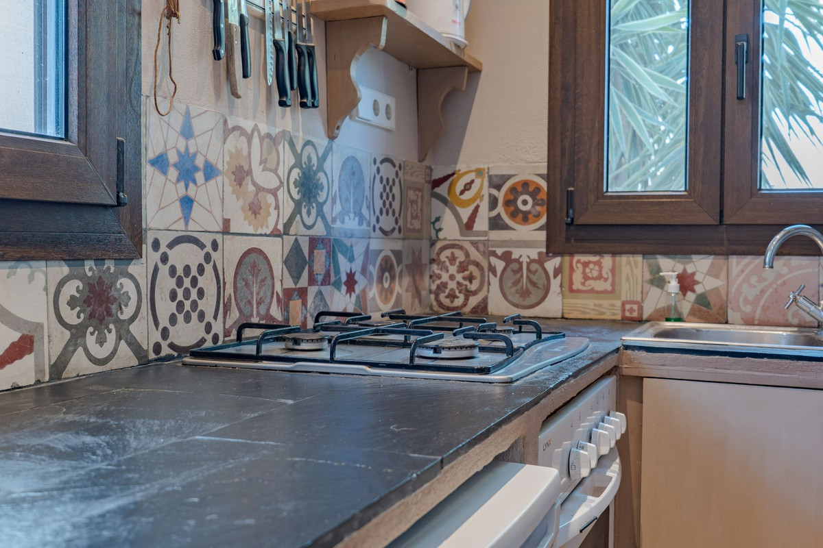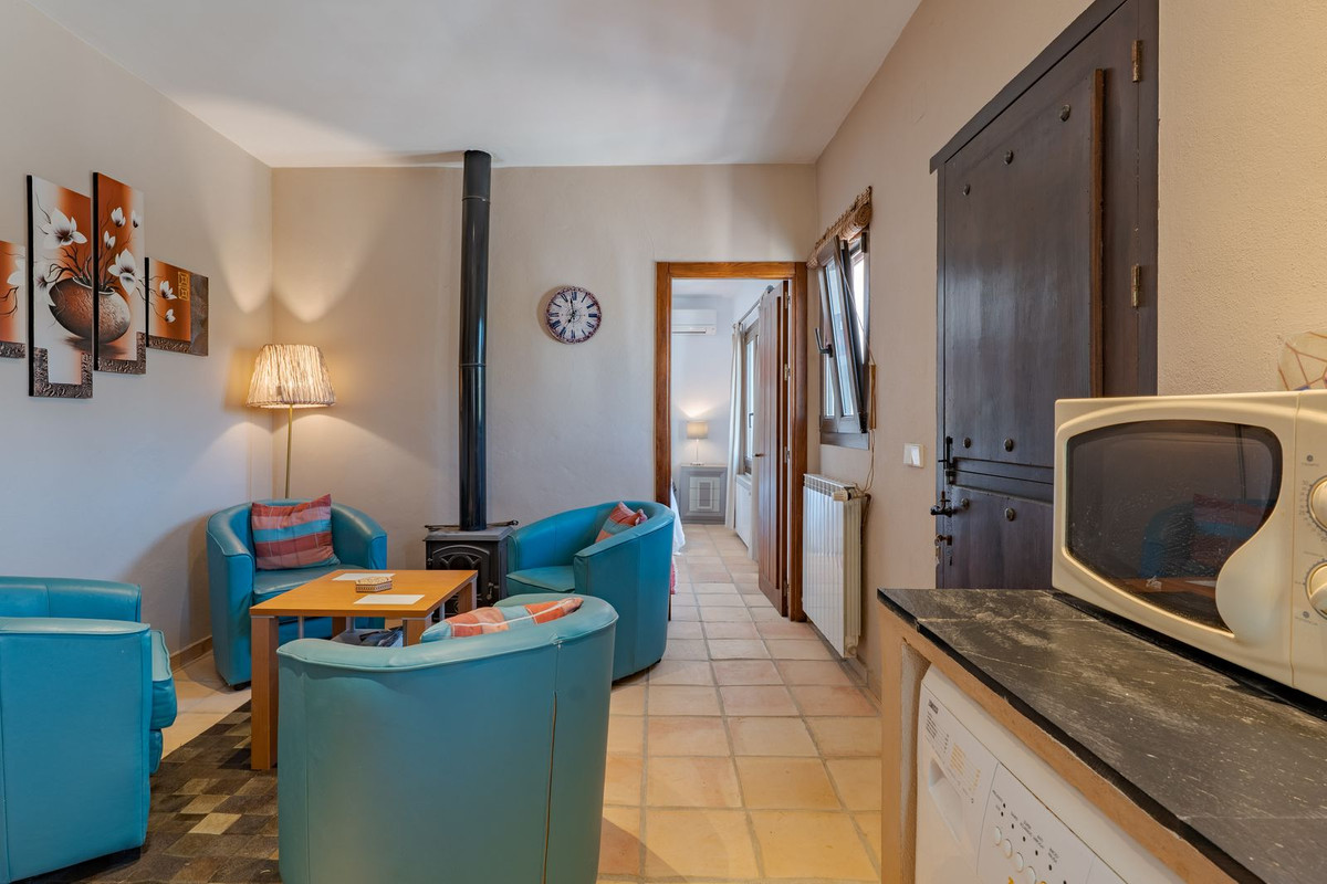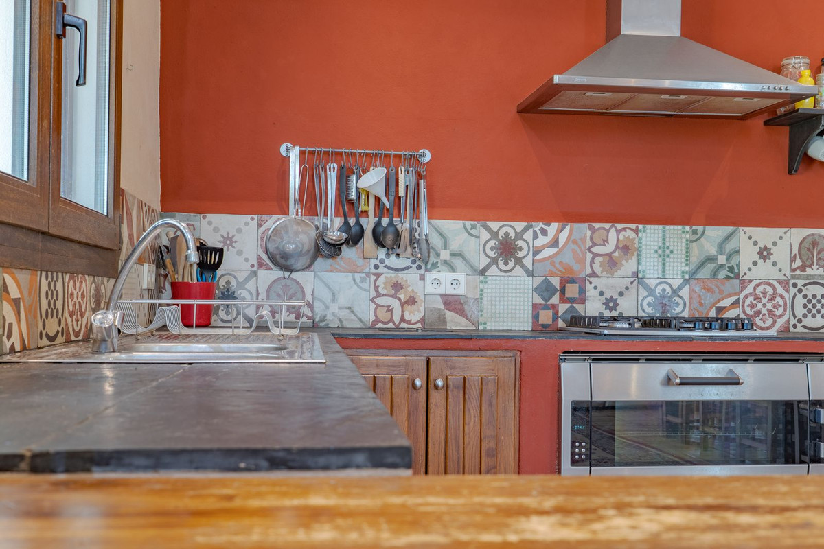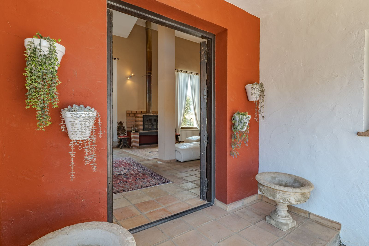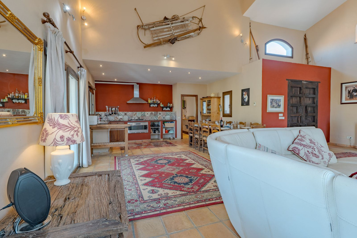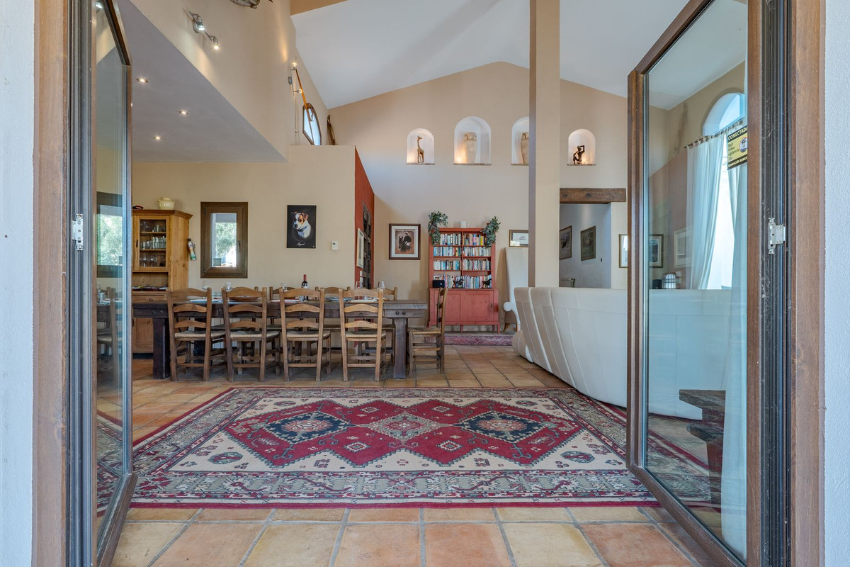 Hauts plafonds et grandes fenêtres : ces éléments architecturaux offrent un maximum de lumière naturelle tout au long de la journée et accentuent la sensation d'espace. Profitez de la chaleur de la cheminée lors des soirées plus fraîches, entourée de charmants sols en terre cuite et de la belle porte d'entrée en bois espagnol qui souligne l'atmosphère champêtre.