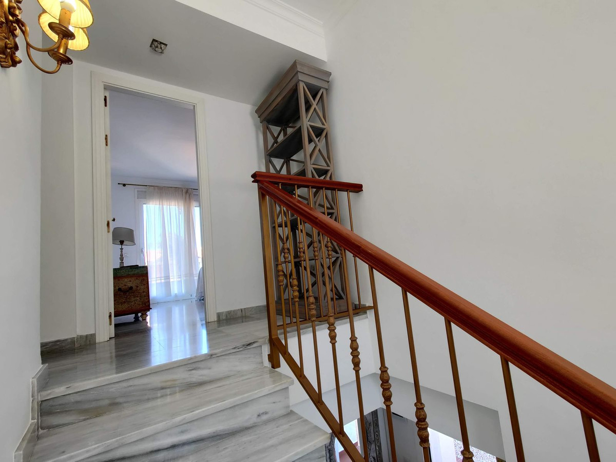 Semi-detached house in Alhaurín Golf urbanization, with beautiful panoramic views of the countryside. Main floor with: entrance hall, living-dining room with fireplace and access to a west-facing garden terrace with Jacuzzi, full bathroom with shower, large and fully equipped kitchen and access to a porch with barbecue and a rear garden with tropical plants, swimming pool and orientation East. Upper floor, has 3 large bedrooms, the master bedroom with terrace, beautiful views and bathroom en suite. Two large bedrooms and a bathroom with shower. The urbanization is residential, quiet, with a fantastic golf course and golf club with bar, restaurant, where you can enjoy beautiful views.