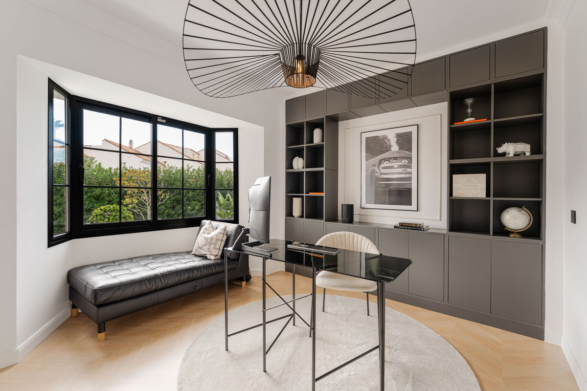 This Elegant Contemporary villa for sale in the residential neighbourhood of Monte Biarritz offers a rare opportunity to own a fully modernised home that blends Scandinavian elegance with intelligent home living. Situated just a five-minute drive from the beach, the villa features six spacious bedrooms, four bathrooms, each designed with a focus on comfort and sophistication. The villa is distributed across three levels, with a total built area 448m2, including expansive interior spaces and a generous garden that captures the best of Mediterranean outdoor living.