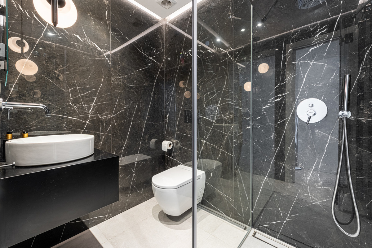 The upper level is equally impressive, housing two bedrooms, each with an ensuite bathroom. The master suite, with its walk-in closet, opens to a terrace with a heated plunge pool, offering panoramic sea views. The second bedroom, designed for afternoon relaxation, presents a west-facing terrace with serene mountain views.