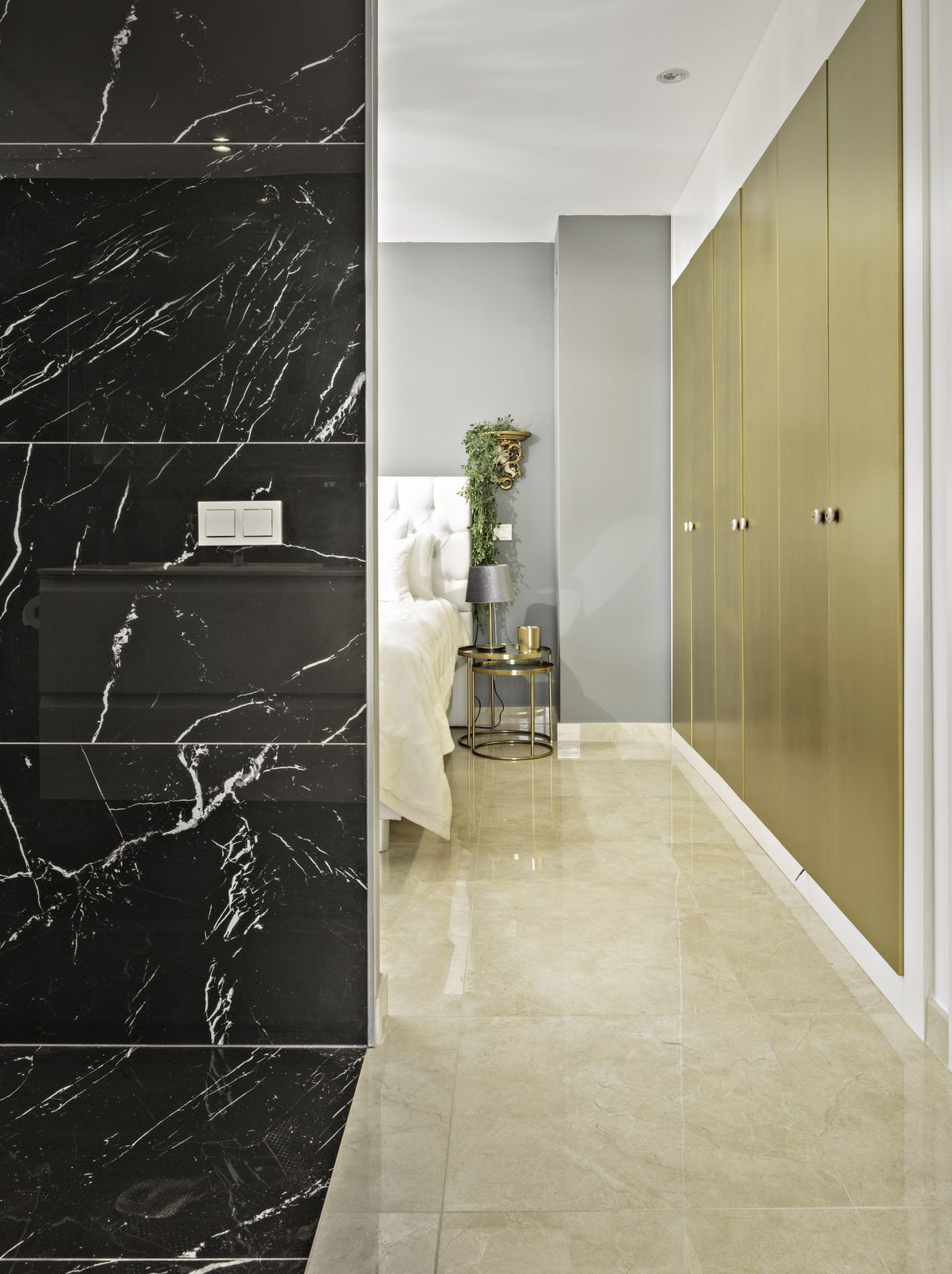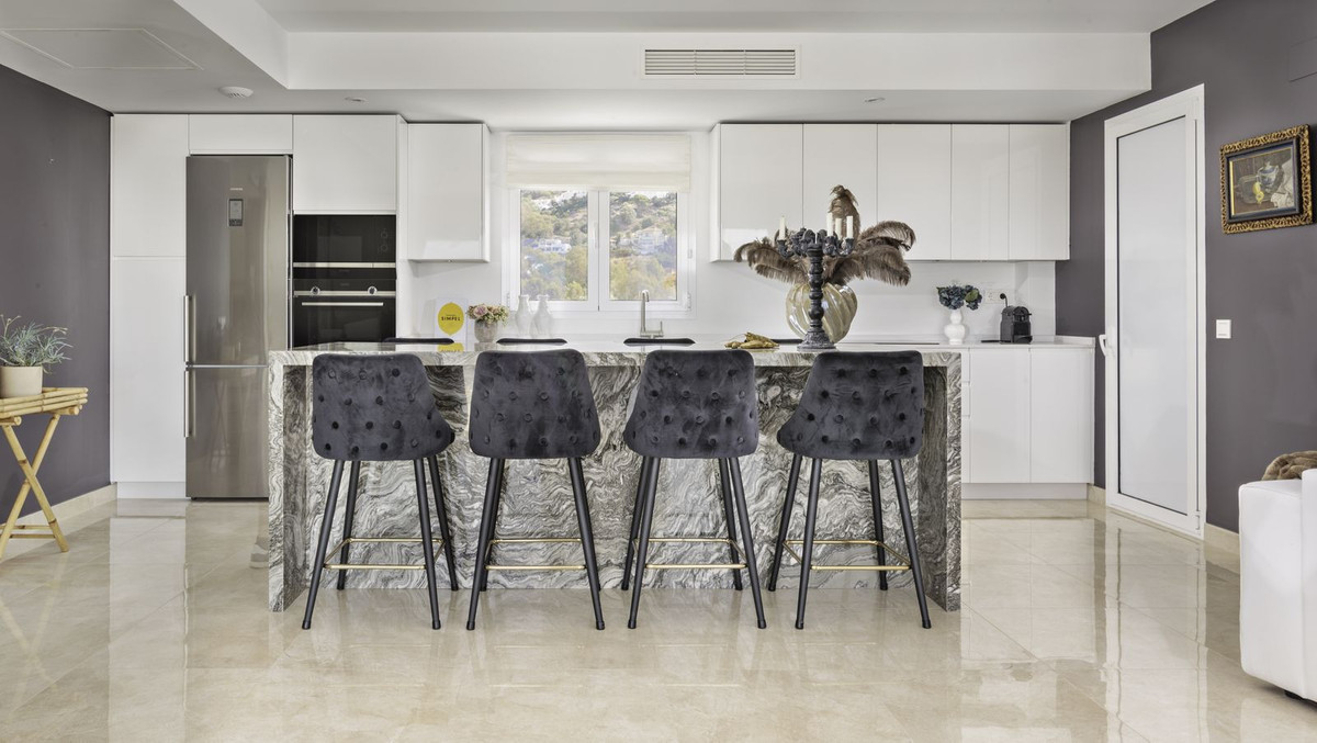 A semi-private elevator takes us to this fantastic penthouse. On the first level, we find a bright and spacious open-plan living area, with raised ceilings that give this particular apartment a feeling of openness as you walk in. This duplex has beautiful Porcelanosa flooring throughout, and a well-equipped kitchen that features a gorgeous quartzite countertop island, perfect for entertaining or enjoying a relaxing brunch. A pretty view of the hills can be enjoyed from the window over the sink. All ceiling lights throughout the house are energy-efficient and dimmable, for an easy change in ambiance depending on the occasion.