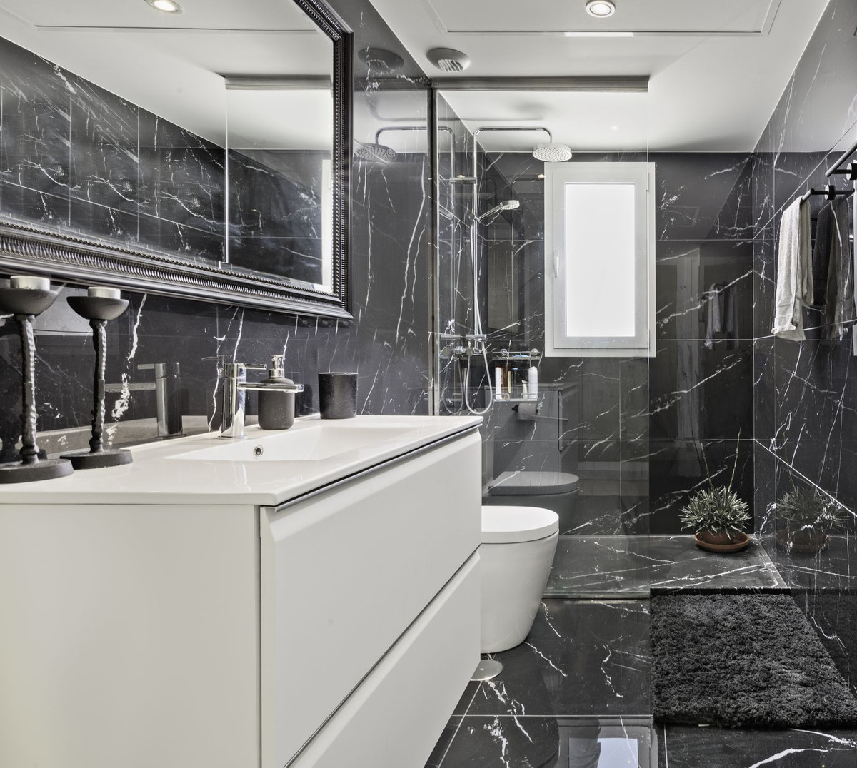 A sophisticated modern stairway with a large window (offering sea views) leads us upstairs to the master bedroom, a luxe and inviting space where one can enjoy spectacular views of the sea and coastline while lounging in bed. On a clear day, the outline of the African mountain range can be seen, along with Gibraltar and the nearby Sierra Blanca mountain range. The room comes with ample built-in closets. The ensuite bathroom is done in black slabs with white veining, which, juxtaposed with the white sink and cabinetry, makes it simply stunning!! On that same level, we find a large second terrace, ideal for sunbathing, as it is entirely private, where one can enjoy a snack at the high table and, undoubtedly, the incredible 360º views. It comes equipped with an outdoor shower, a nice addition for a quick refresh while enjoying the summer sun.