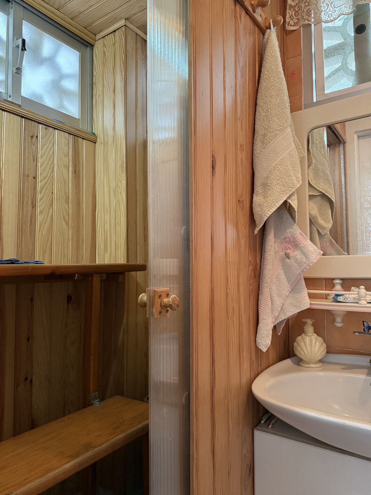L'appartement comprend un hall d'entrée, un séjour/salle à manger donnant sur une terrasse vitrée ensoleillée l'après-midi et offrant une vue sur la piscine de la résidence voisine. Attenante au séjour se trouve la cuisine entièrement équipée, et à côté, une buanderie avec espace de rangement et un petit sauna avec WC et douche. Depuis le séjour, un couloir intérieur dessert une salle de bains avec baignoire et trois chambres avec placards intégrés.