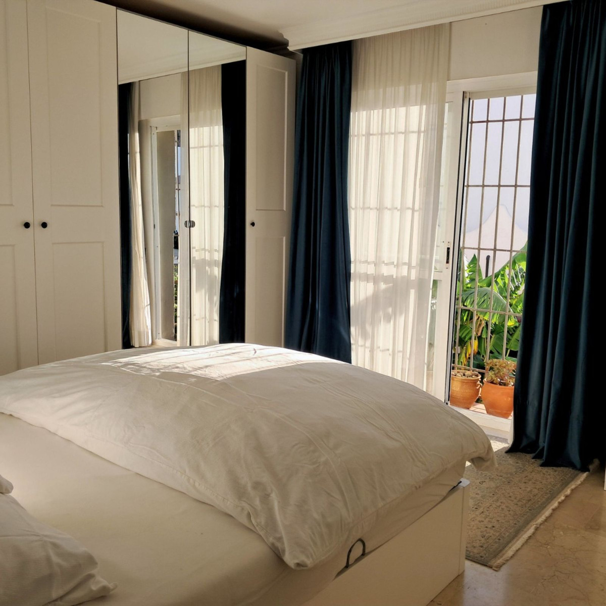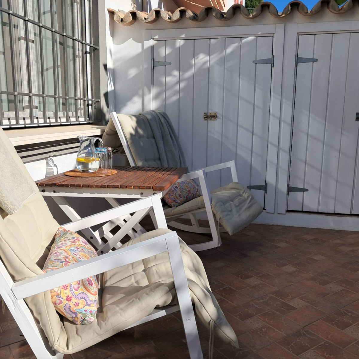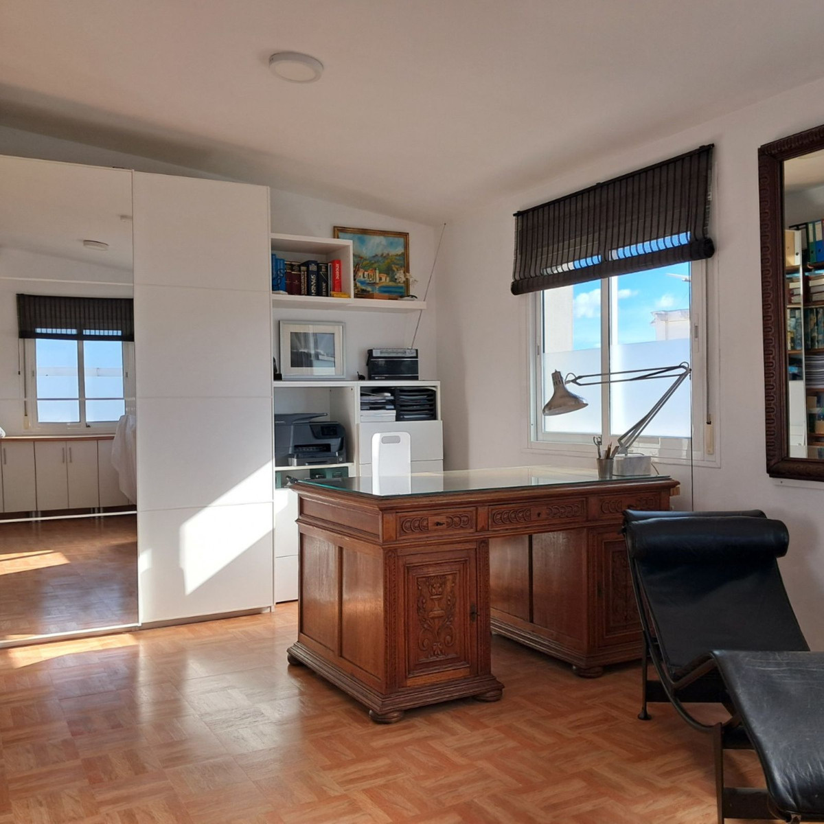 Au premier étage se trouvent trois chambres et deux salles de bains. La chambre principale dispose d'une salle de bains privative, tandis que la salle de bains familiale a été entièrement rénovée avec des matériaux haut de gamme. Le deuxième étage abrite une quatrième chambre spacieuse, actuellement aménagée en bureau, qui donne directement sur une terrasse de 18 m² sur le toit, entièrement rénovée en 2022, offrant une vue partielle sur la mer et même un aperçu de Gibraltar.