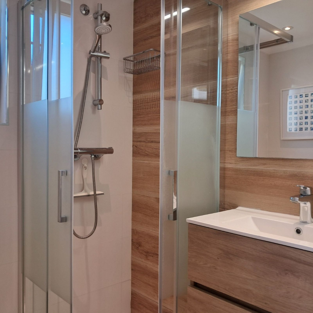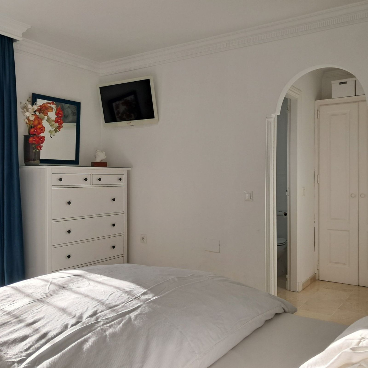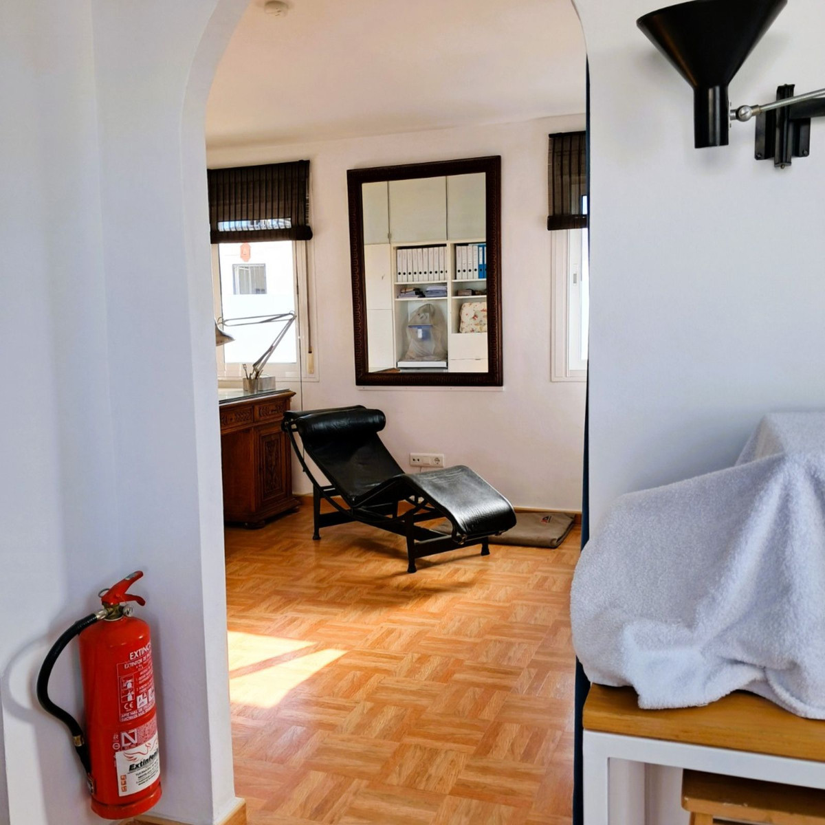 Au premier étage se trouvent trois chambres et deux salles de bains. La chambre principale dispose d'une salle de bains privative, tandis que la salle de bains familiale a été entièrement rénovée avec des matériaux haut de gamme. Le deuxième étage abrite une quatrième chambre spacieuse, actuellement aménagée en bureau, qui donne directement sur une terrasse de 18 m² sur le toit, entièrement rénovée en 2022, offrant une vue partielle sur la mer et même un aperçu de Gibraltar.