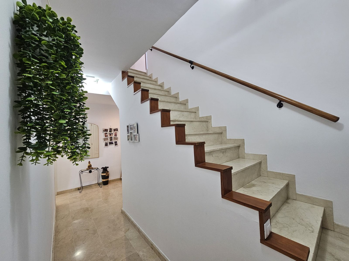 Premier étage : En montant l’escalier, vous accédez à un charmant espace salle à manger/salon. C’est également l’entrée principale de la propriété ; ainsi, si vous recevez des visiteurs, ils n’auront pas besoin de passer par les chambres. Cet espace est totalement séparé des espaces de détente. Une grande terrasse de 20 m² offre une vue sur la piscine, la montagne et, au loin, la mer.