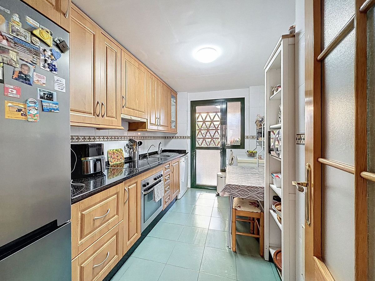 La cuisine indépendante est entièrement équipée et comprend une buanderie, offrant une grande fonctionnalité au quotidien. Les deux chambres disposent de grands placards intégrés, et les salles de bains sont dotées de baignoires, pour un design à la fois classique et confortable.