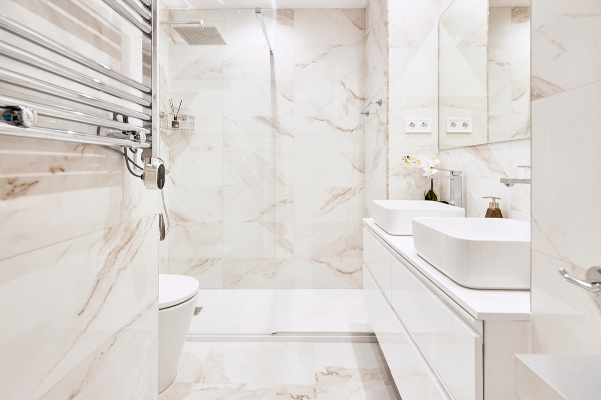 Style scandinave, salle de bains et toilettes invités flambant neuves, cuisine et salon ouverts.