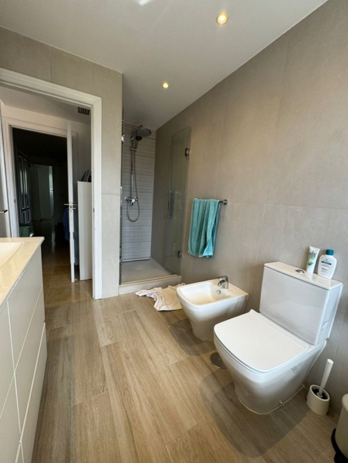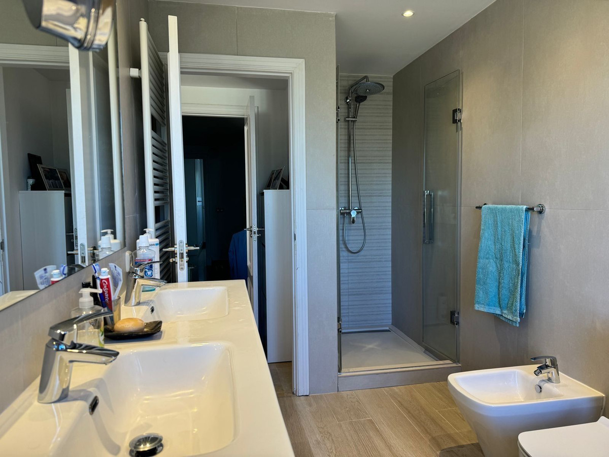 Cette maison de ville s'étend sur trois étages, auxquels s'ajoute une terrasse sur le toit, le tout avec des finitions haut de gamme. Au rez-de-chaussée, vous trouverez un vaste séjour/salle à manger s'ouvrant sur une grande véranda et un jardin privatif, une cuisine entièrement équipée et des toilettes invités. Le premier étage abrite la suite parentale, avec salle de bains privative et terrasse, ainsi que deux chambres supplémentaires, chacune avec son propre balcon, partageant une salle de bains. La terrasse sur le toit est un véritable atout, offrant un barbecue intégré et une vue imprenable sur la mer.