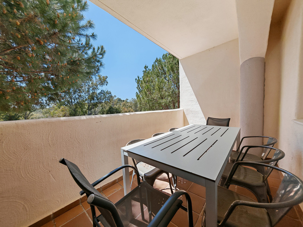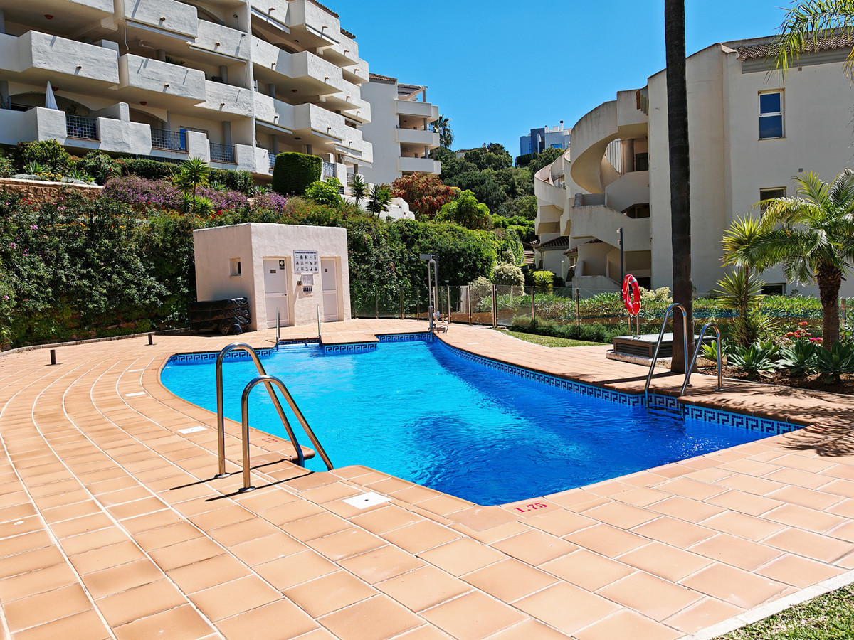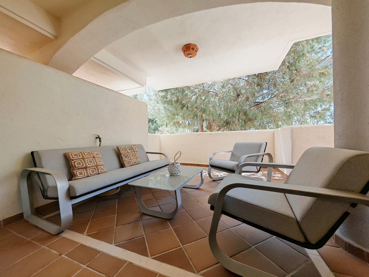 Appartement à vendre à Elviria, Marbella, comprenant 2 chambres, 2 salles de bains (dont une attenante), une orientation sud-ouest, une piscine commune, un garage commun (1 place de parking) et un jardin commun. D'une superficie de 123 m² habitables et 16,25 m² de terrasse, il bénéficie des équipements suivants à proximité : climatisation, entièrement meublé, cuisine équipée, sols en marbre, terrasse privative, réservoir d'eau, vue sur la campagne, piscine intérieure, buanderie, Wi-Fi, terrasse couverte, placards intégrés, résidence sécurisée, ascenseur, accès facile à la mer/plage, golf, balcon, système de refroidissement au plafond, proximité du centre-ville, des écoles, caméras de surveillance, au sein d'un complexe golfique et à proximité des restaurants.