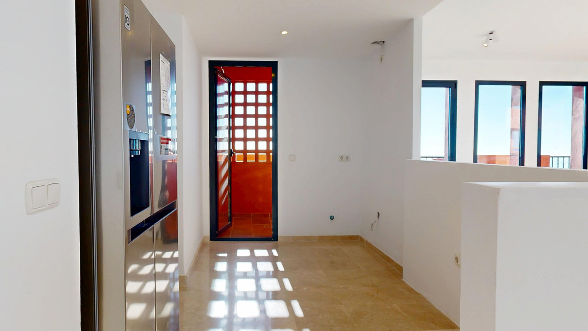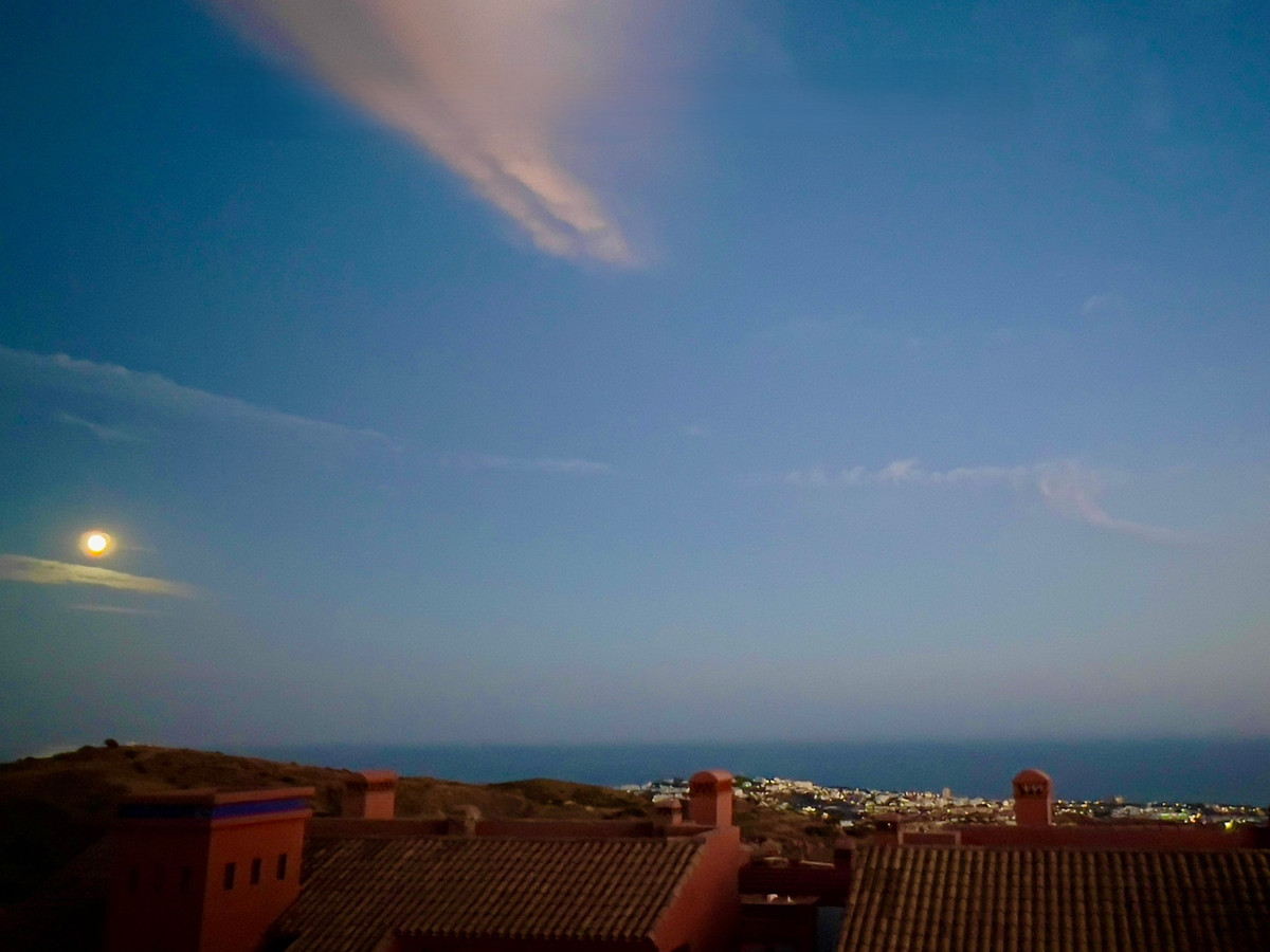 Le cœur de la maison est son vaste séjour-salle à manger, agrémenté d'une cheminée et d'une cuisine ouverte conçue pour la convivialité. La lumière naturelle inonde chaque recoin, se fondant harmonieusement avec les vues spectaculaires sur la mer, Gibraltar et l'Afrique.