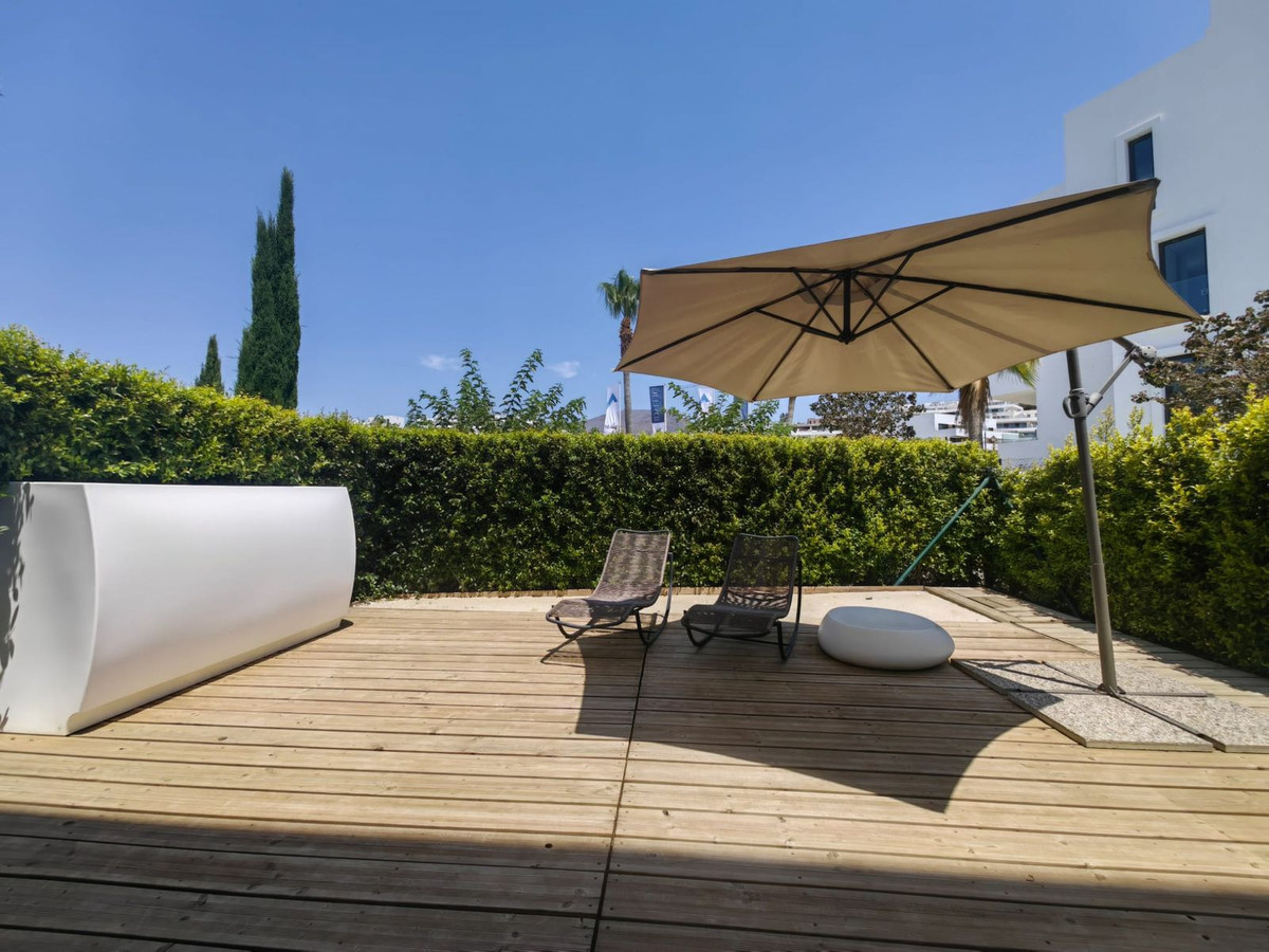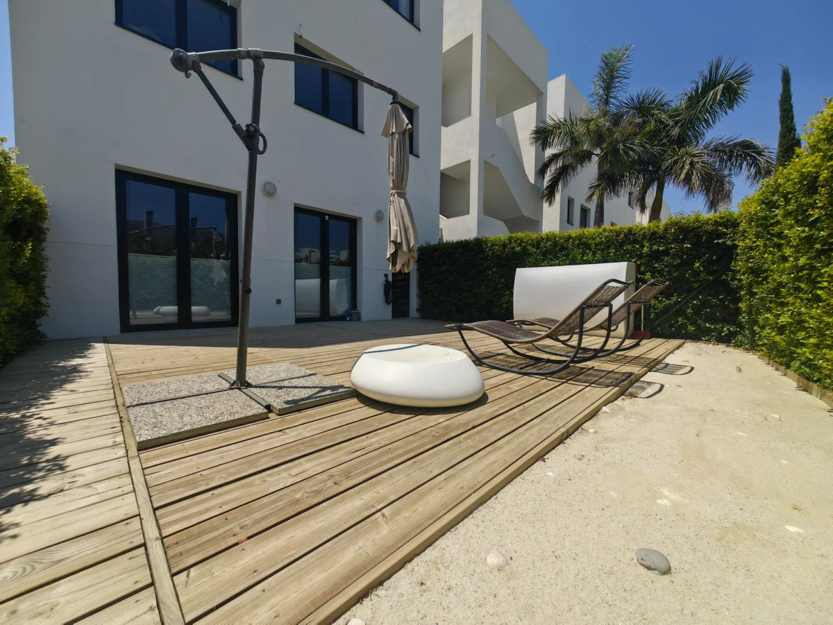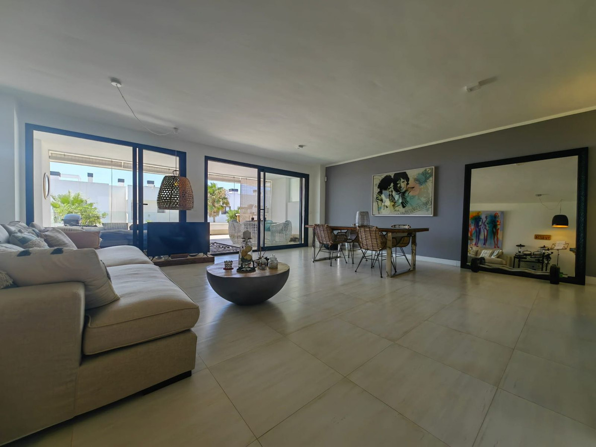 Le séjour lumineux et ouvert s'ouvre sur une grande terrasse semi-couverte exposée plein sud avec vue partielle sur la mer, créant ainsi un cadre idéal pour profiter du soleil de la Costa del Sol tout au long de la journée. À l'arrière, un jardin privé avec terrasse en bois offre un havre de paix, idéal pour les repas en plein air, les barbecues ou tout simplement pour se détendre.