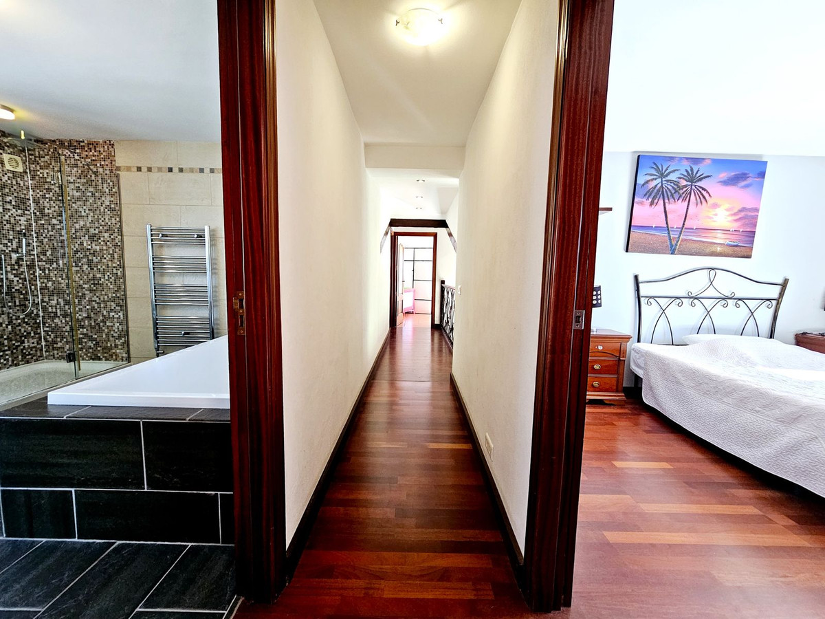 En entrant dans la villa, vous êtes accueilli par une magnifique porte d'entrée andalouse en bois qui s'ouvre sur un hall. À droite, vous trouverez un salon spacieux et lumineux, un bureau, une grande chambre et une salle de bain complète. À gauche, un second salon/coin TV, une cuisine américaine entièrement équipée et un coin repas donnant directement sur les terrasses couvertes et découvertes ainsi que sur le jardin. À l'étage, vous découvrirez la grande suite parentale avec salle de bain attenante, terrasse privée et accès direct au jardin. Trois autres chambres se trouvent également à l'étage, dont une avec terrasse privée. Toutes sont spacieuses et partagent une grande salle de bain avec baignoire et douche. Un espace non aménagé entre deux chambres pourrait facilement être transformé en salle de bain communicante si nécessaire. Toutes les chambres sont climatisées (chaud/froid).