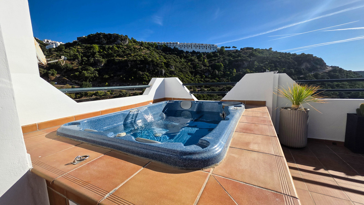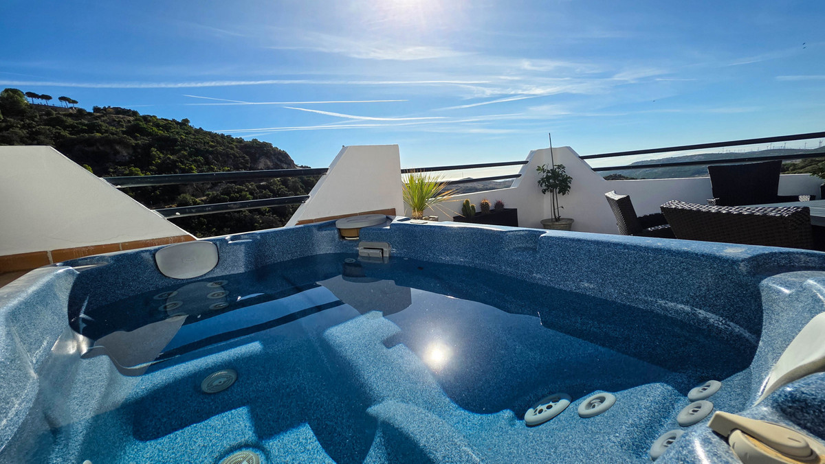 Cette propriété comprend trois chambres, deux salles de bains et des toilettes invités, judicieusement réparties dans des espaces de vie lumineux et aérés. Plusieurs balcons offrent des points de vue exceptionnels, tandis que le solarium privé avec jacuzzi invite à la détente et à profiter du calme de ce cadre pittoresque.