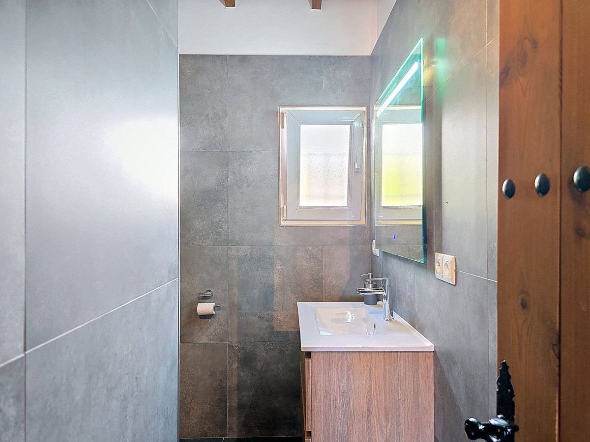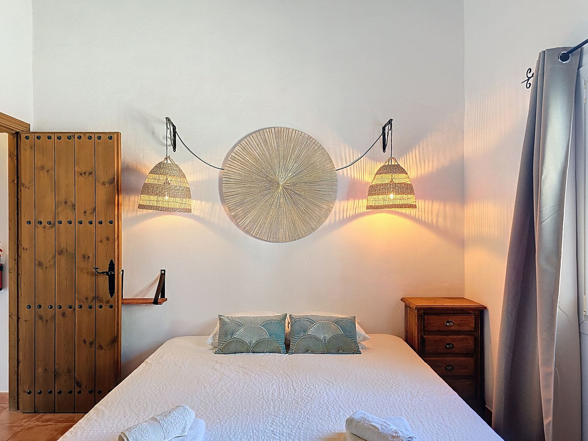 La propriété comprend trois chambres doubles spacieuses, chacune dotée de rangements intégrés et offrant une vue sur la campagne environnante. L'une des chambres bénéficie d'une salle de bains privative, pour plus d'intimité et de confort. Une seconde salle de bains familiale, ornée de carreaux andalous traditionnels et d'équipements modernes, offre un espace lumineux et fonctionnel, aussi bien pour les résidents que pour leurs invités.