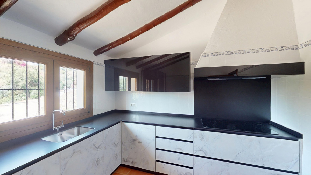 Cette ravissante villa espagnole, située à Viñuela, dans la province de Malaga, offre un parfait mélange de charme traditionnel et de confort moderne. De plain-pied, elle s'étend sur 167 m² et comprend trois chambres, dont une spacieuse suite parentale de 13,9 m², ainsi que deux salles de bains. Dès l'entrée, on est séduit par son atout majeur : un magnifique sol en terre cuite qui s'étend sur toute la surface, créant une ambiance espagnole authentique et harmonieuse. Les pièces à vivre se caractérisent par leurs hauts plafonds mansardés aux poutres apparentes, qui ajoutent une touche rustique et un cachet unique. Le cœur de la maison est sans conteste le salon, dont la pièce maîtresse est une superbe cheminée en pierre. De grandes fenêtres et des portes-fenêtres, présentes dans cette pièce comme dans les chambres, laissent entrer une abondante lumière naturelle tout en offrant des vues pittoresques sur le paysage environnant. La cuisine présente un mélange harmonieux de design traditionnel et contemporain. Les appareils électroménagers modernes et les élégants meubles contrastent avec les poutres apparentes du plafond, créant un espace culinaire à la fois fonctionnel et esthétique. Les salles de bains, bien que peu détaillées sur les photos, semblent avoir été modernisées. Des rangements astucieusement intégrés sont présents dans toute la maison, notamment des placards en bois encastrés dans les chambres qui préservent le charme rustique de l'ensemble. La propriété dispose également de deux patios, offrant de ravissants espaces extérieurs pour la détente et les réceptions. L'un des atouts de cette villa réside dans le soin apporté aux détails décoratifs, tels que les frises de carrelage ornementées dans les couloirs et les salles de bains, qui ajoutent une touche d'élégance espagnole traditionnelle à des intérieurs par ailleurs sobres et raffinés. À l'extérieur, la villa bénéficie d'une magnifique piscine et d'un charmant espace extérieur, idéal pour profiter du climat méditerranéen. En somme, cette villa de Malaga offre une atmosphère chaleureuse et accueillante, alliant avec brio les éléments architecturaux espagnols traditionnels au confort moderne, pour créer un lieu de vie exceptionnel. Nous sommes ravis de pouvoir vous présenter prochainement cette propriété de rêve, en personne ou par visite virtuelle. Car ce monde est unique, à l'image de notre Axarquía. En Andalousie. Sur la Costa del Sol. Ici, sous le soleil…