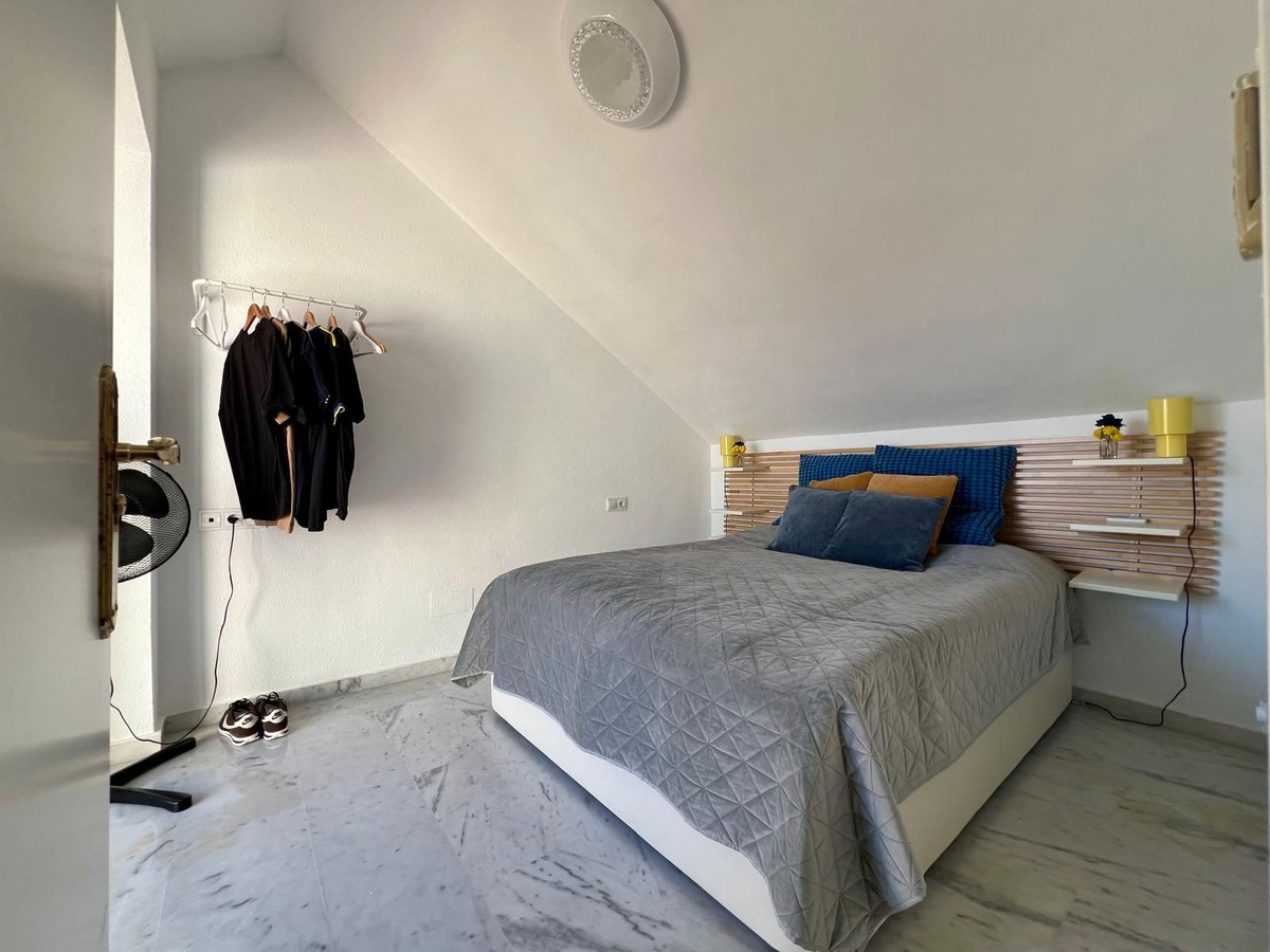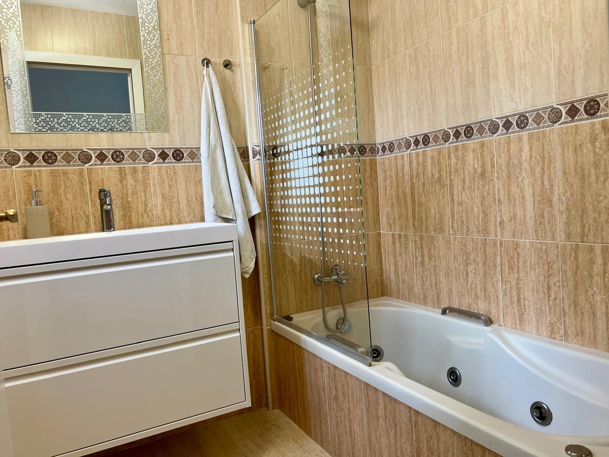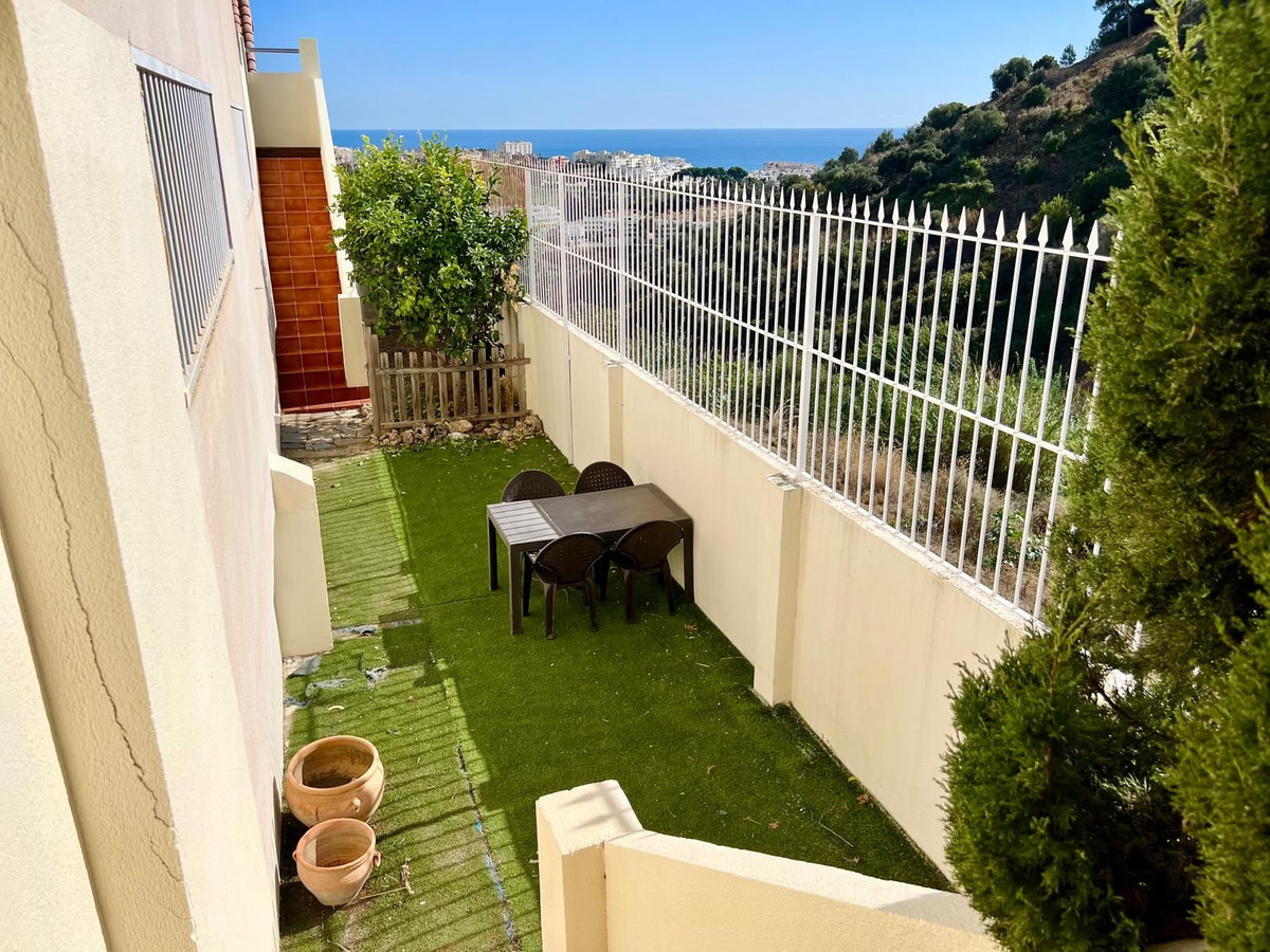 Maison de ville à Torrequebrada, Benalmádena. Accès direct depuis la maison à un garage privé pour deux voitures. Piscine chauffée privée et terrasses + jardin/patio supplémentaire (emplacement en angle). Piscine équipée d'un moteur, de canalisations et d'un système de chauffage réversible neufs.