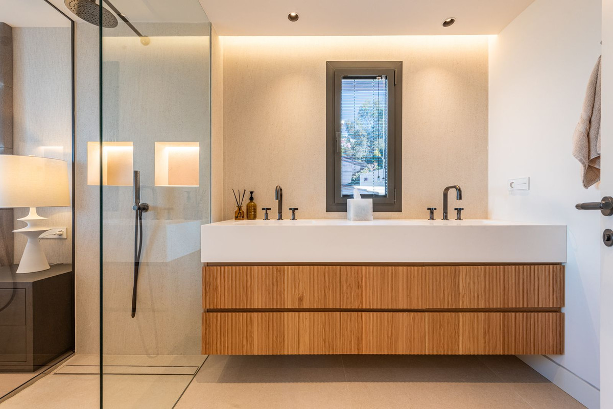 Les espaces extérieurs sont tout aussi impressionnants. Orientée sud-ouest, la terrasse offre des couchers de soleil spectaculaires ainsi qu'une vue panoramique sur les montagnes, la nature luxuriante et la mer Méditerranée. Une cuisine d'été moderne et élégante et un coin repas en plein air raffiné rendent la vie au grand air facile et agréable.