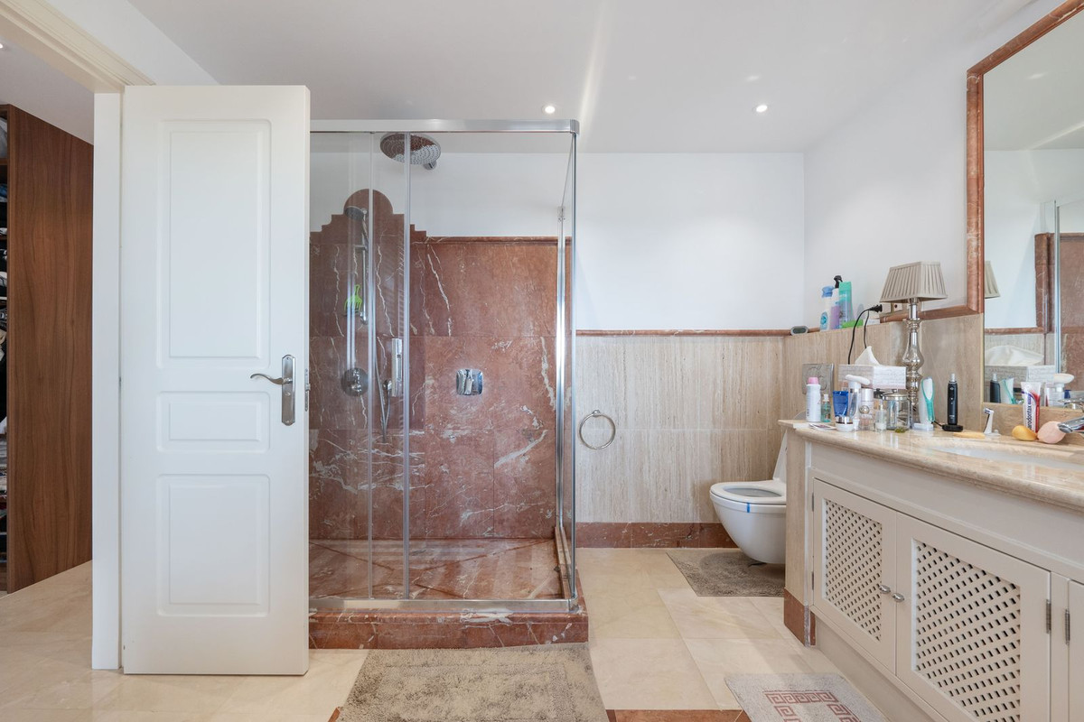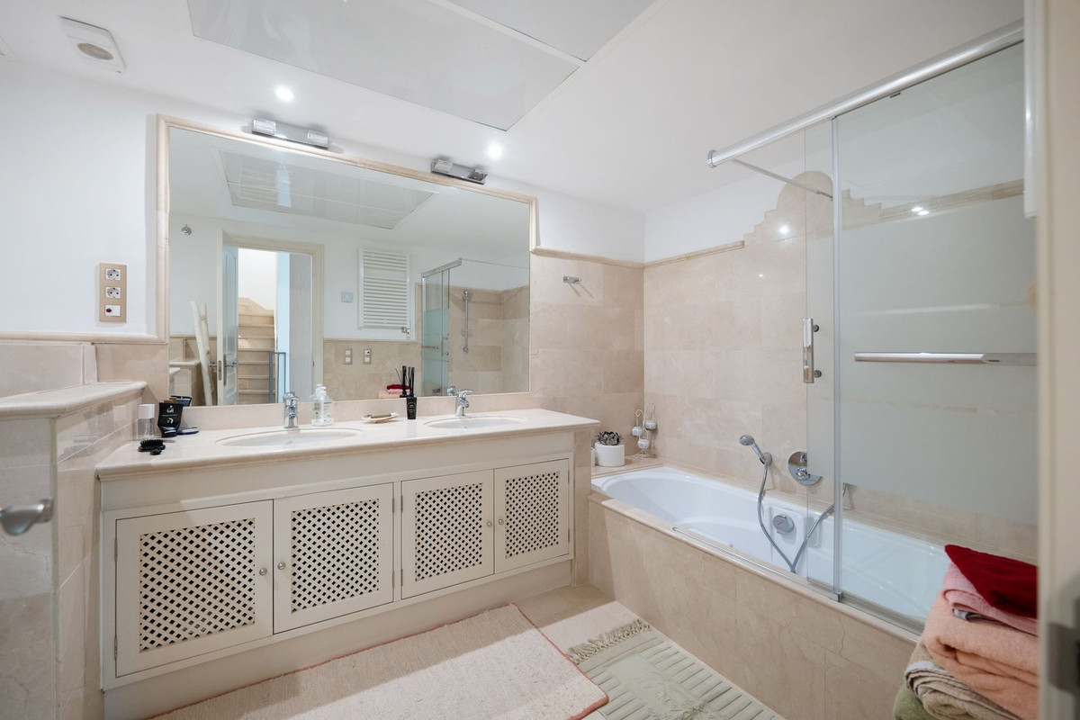 Cette maison de ville comprend quatre chambres au total. Deux se trouvent au premier étage et deux au sous-sol. La chambre principale, située au premier étage, dispose d'un dressing et d'une salle de bains privative. La chambre adjacente possède également sa propre salle de bains. Les deux chambres offrent une vue imprenable sur la mer et les montagnes.