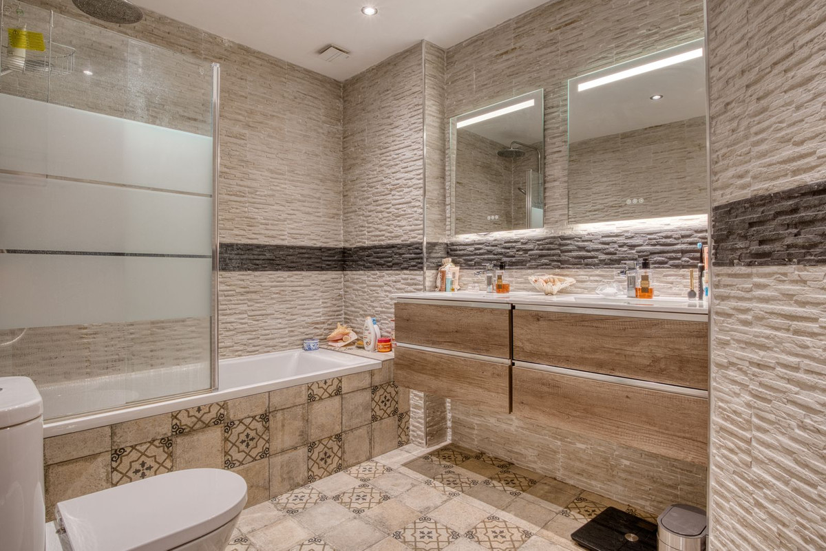 The middle level houses four spacious double bedrooms, designed to offer flexibility for guests and family members. Two newly renovated bathrooms, including one en-suite, feature twin sinks and vanity units. A wide terrace on this level is accessible from three south-facing bedrooms, providing a serene and relaxing retreat.
