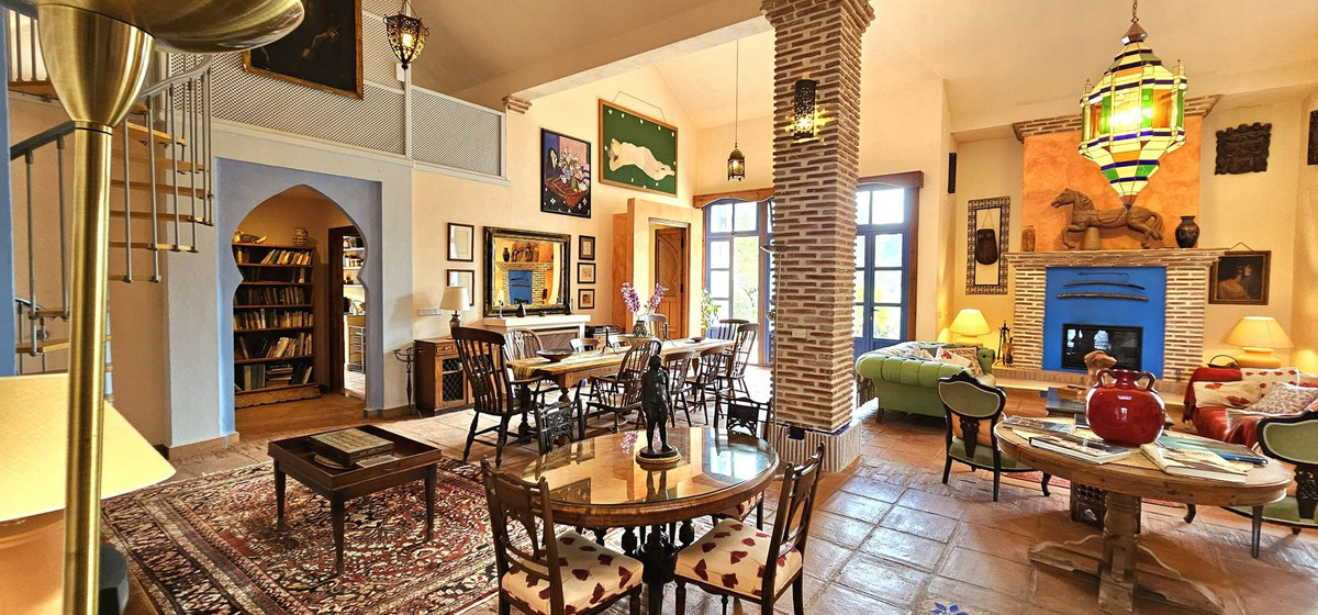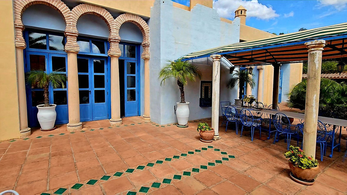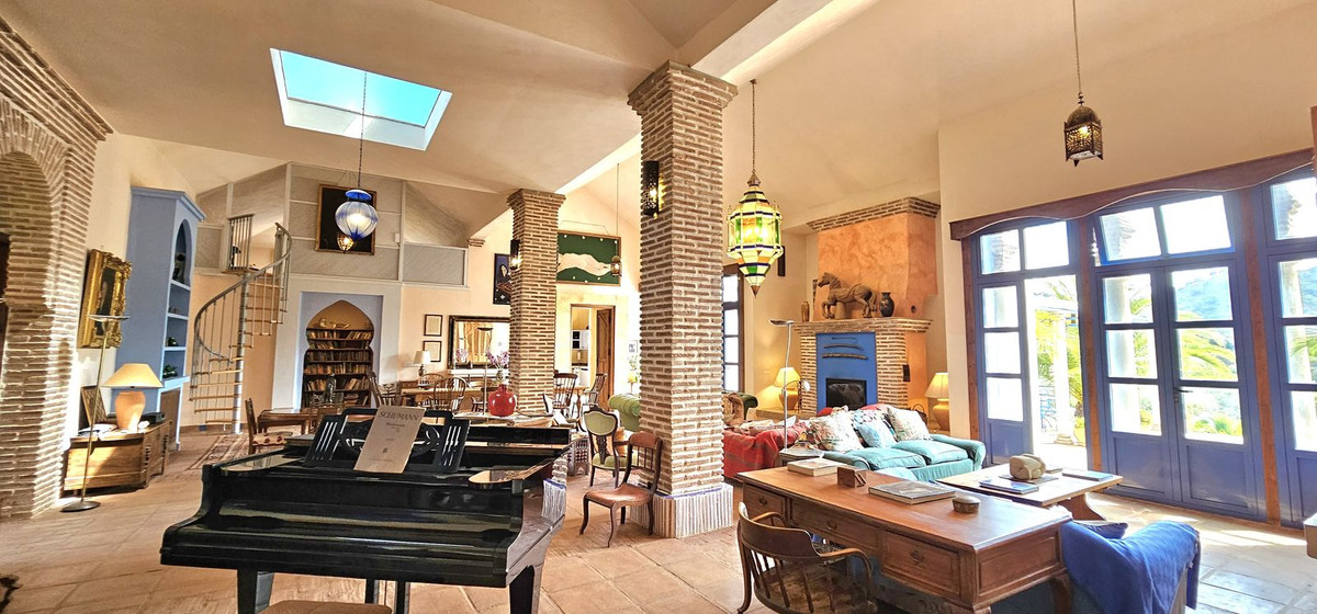 Access to the property is via a short dirt road that leads to a private electric gate, shared with just four other properties. As you ascend to the mountaintop, you’ll be greeted by an imposing antique wooden door that ushers you into a grand entry hall. To the left and right, you’ll find two en-suite guest bedrooms. Straight ahead, the magnificent living room beckons, cleverly divided into distinct areas by elegant pillars—an inviting lounge area with a generous fireplace, a dining area adjacent to the well-appointed kitchen, and a cozy music or study nook. French doors open seamlessly to the terrace, providing unobstructed views of the surrounding landscape and mountains. When all the doors are open, the distinction between indoor and outdoor living fades, allowing you to fully savor the Andalusian outdoor lifestyle.