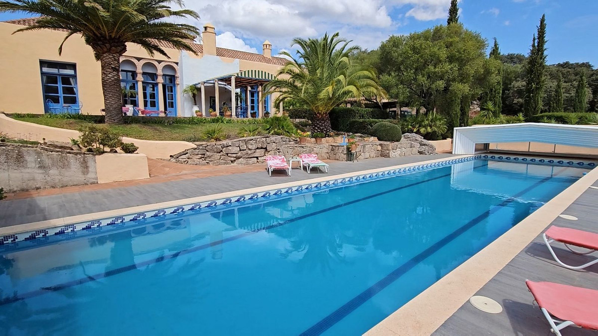 Surrounded by a rustic landscaped garden featuring palm trees and cypresses, the main house connects seamlessly with the pool area via a large terrace. Wide steps and a ramp lead down to the impressive 20x5m pool, which can be covered by a retractable greenhouse-type roof and heated for year-round enjoyment. The pool area is adorned with sunbathing terraces and vibrant flowers. A pool house with a shower, which could also double as a gym, completes the outdoor oasis.