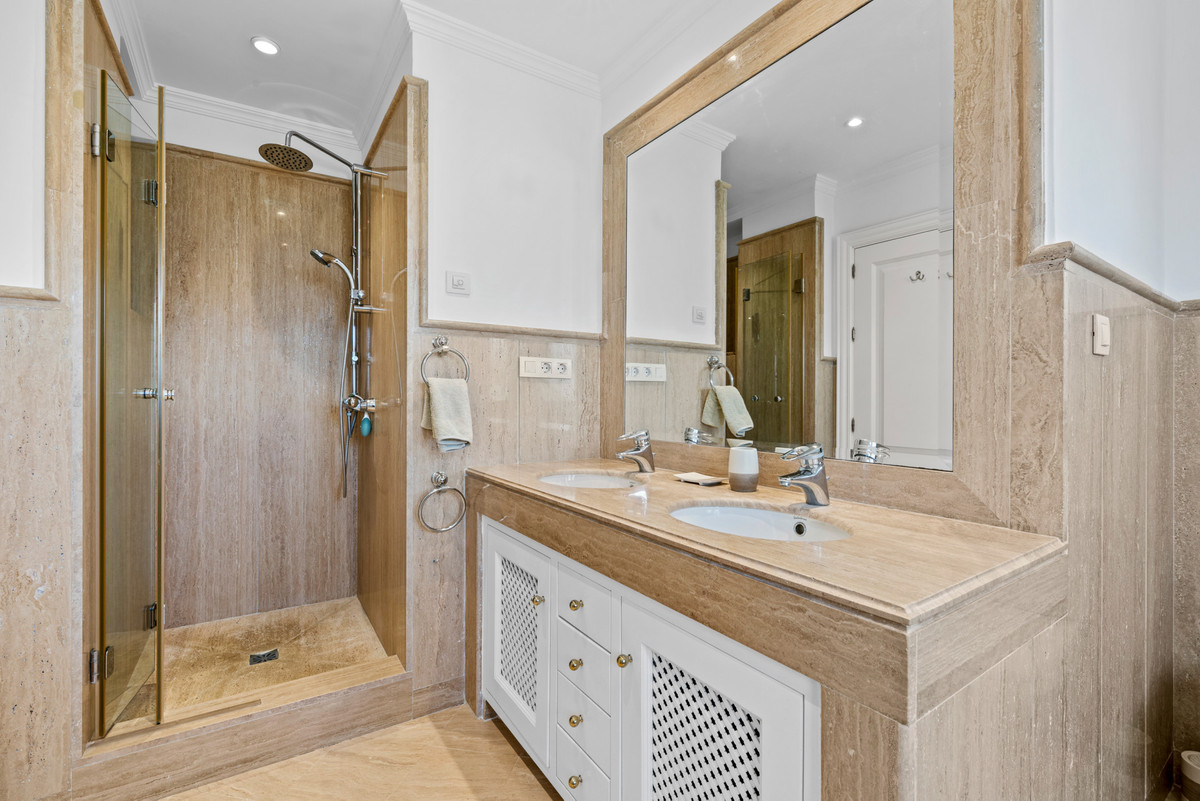 La propriété comprend trois chambres doubles avec salle de bains privative, dont une suite parentale dotée d'une grande salle de bains avec baignoire jacuzzi d'angle, douche à l'italienne et double vasque. Chaque chambre donne directement sur la vaste terrasse. Un WC séparé est également disponible. La climatisation est installée dans toute la propriété, et le chauffage au sol est présent dans les salles de bains.