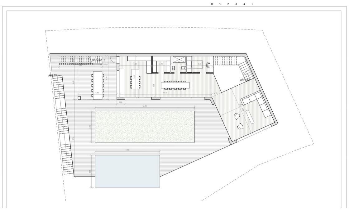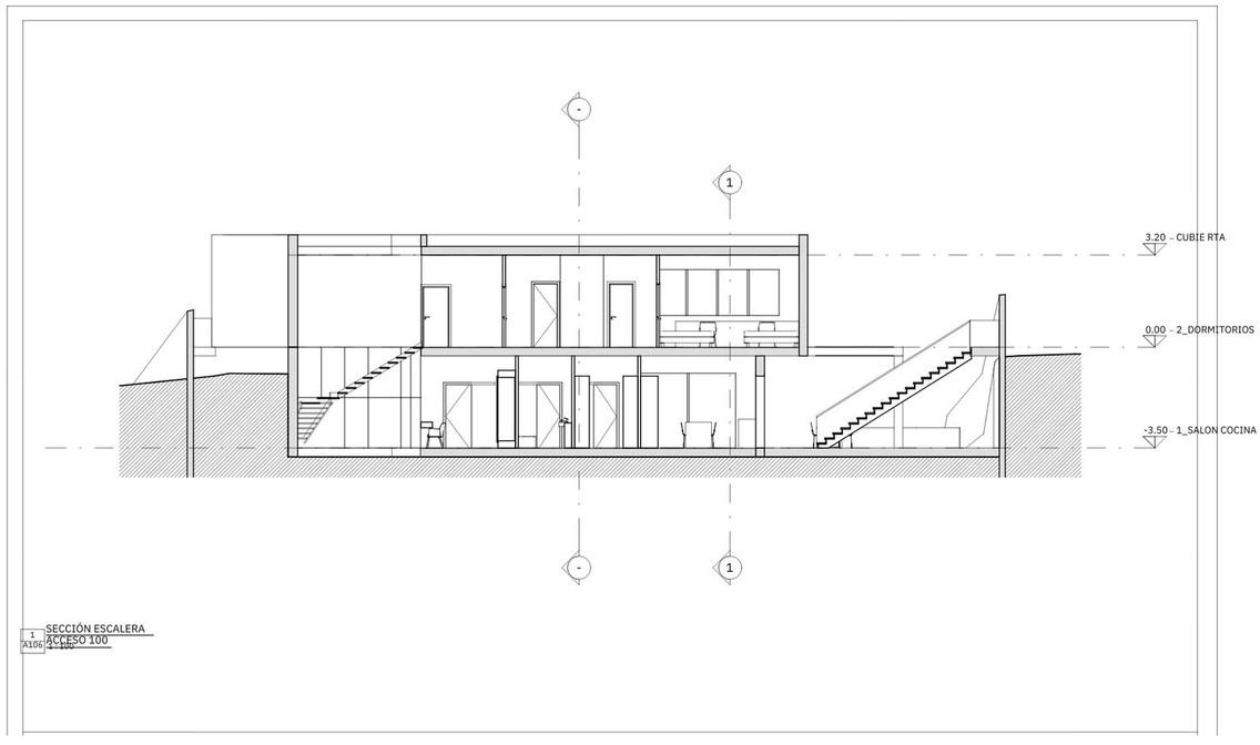 Rez-de-chaussée/Niveau d'accès (Espace de vie) : Salon, cuisine/salle à manger, toilettes, patio intérieur et bureau.