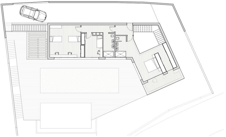 La maison projetée est moderne et fonctionnelle, avec deux niveaux agencés autour d'un patio latéral qui assure éclairage et ventilation.