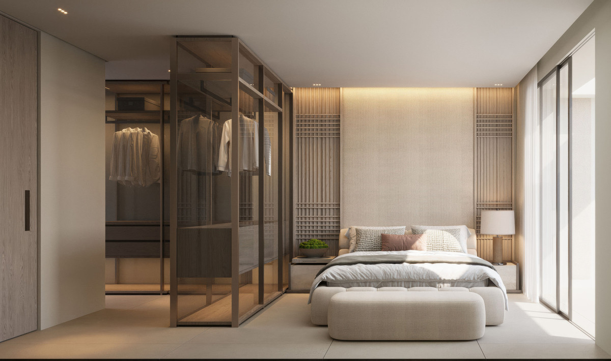 Les chambres offrent la même sensation de calme et de qualité que le reste de l'appartement. Spacieuses et dotées de placards intégrés, elles arborent une finition moderne et épurée qui leur confère une atmosphère chaleureuse et ordonnée. La chambre principale s'ouvre directement sur la terrasse, baignant l'espace de lumière naturelle du matin au soir. Les deux salles de bains, aménagées avec des matériaux haut de gamme et un éclairage doux, offrent un cadre raffiné, presque digne d'un spa. Ensemble, chambres et salles de bains apportent un confort et une fonctionnalité qui font de ce logement un véritable havre de paix.