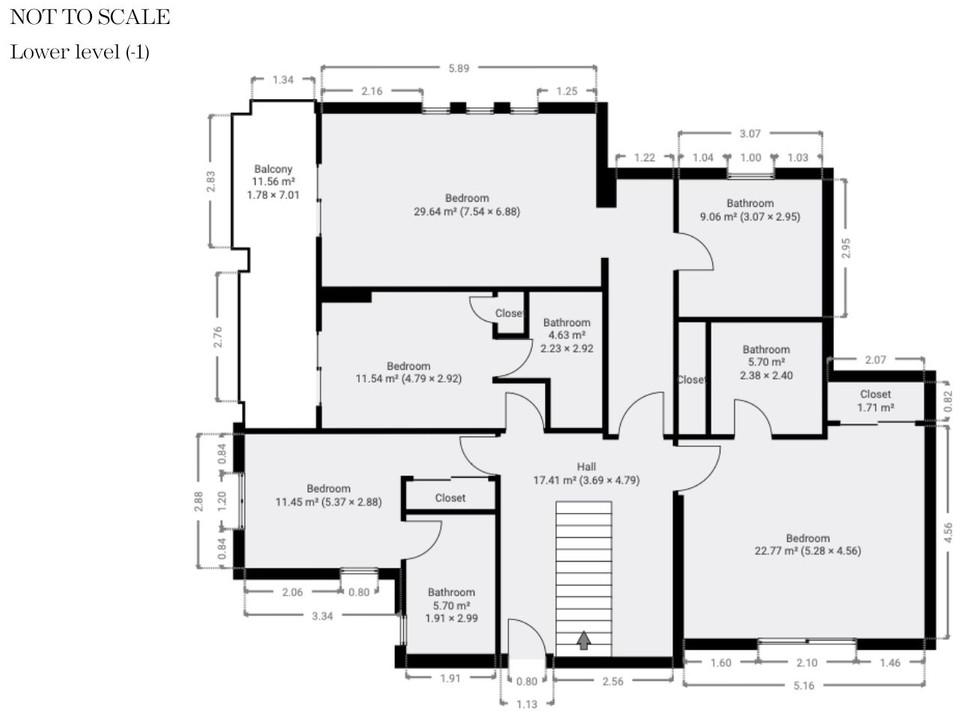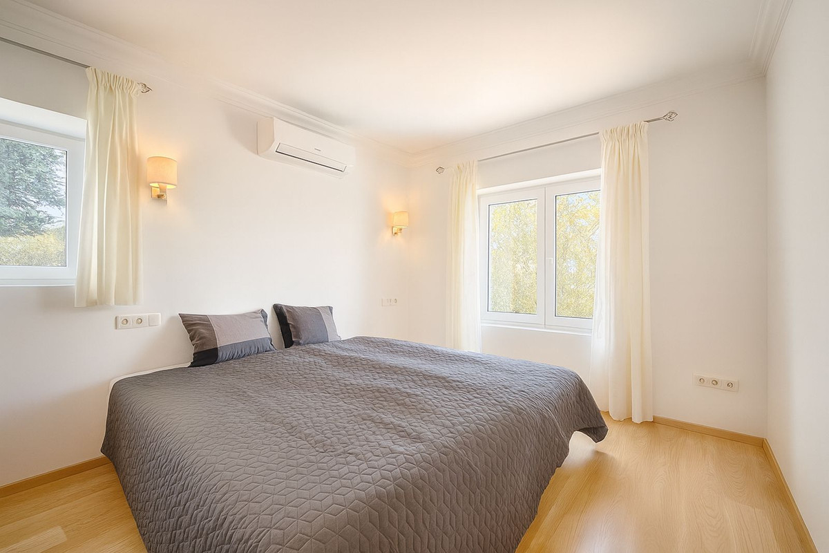 Au même étage se trouve une cuisine moderne ouverte sur une buanderie, ce qui optimise la circulation et facilite l'accès. À l'étage inférieur, quatre chambres lumineuses et spacieuses disposent chacune d'une salle de bains privative et de placards intégrés.