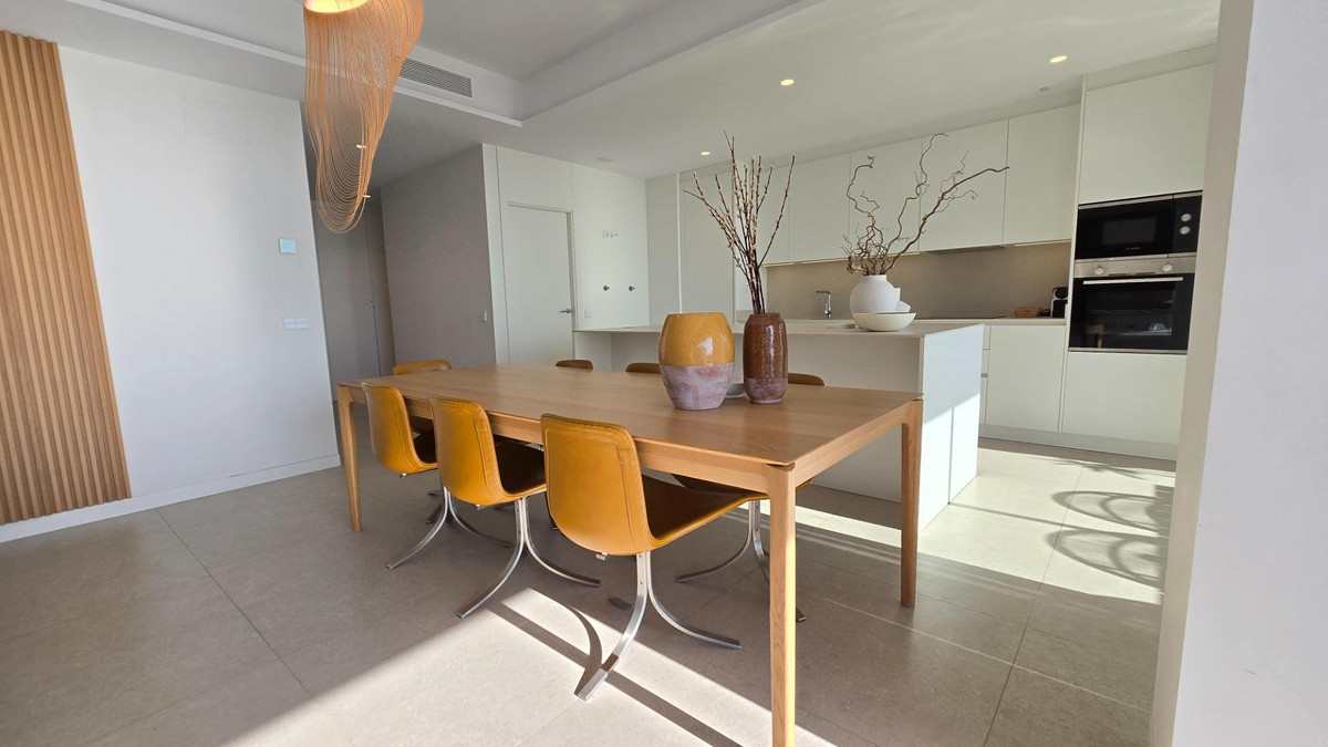 The open-plan living and dining room integrate with a large private terrace from where you can enjoy unbeatable views of the Mediterranean and unforgettable sunsets. The designer kitchen, equipped with state-of-the-art appliances, quartz countertops, and elegant furniture, provides both style and functionality. The apartment also offers a private balcony ideal for outdoor dining, central air conditioning, and smart home features.