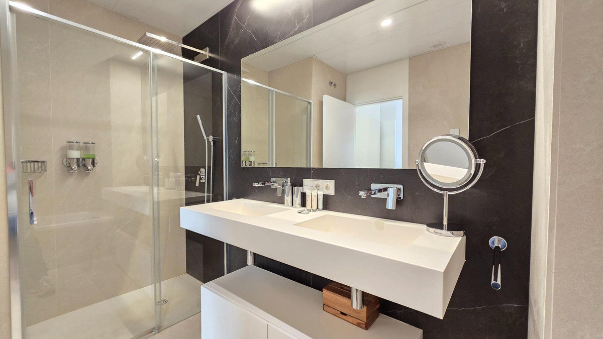 The master bedroom is an authentic private retreat with an en-suite bathroom that includes a shower and bathtub, offering a unique wellness environment. The other bedrooms also stand out for their spaciousness, natural light, and built-in wardrobes, while the additional bathroom incorporates a walk-in shower, premium faucets, and sophisticated stone finishes. The guest toilet completes the layout with a modern design in stone and wood.