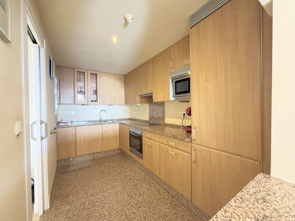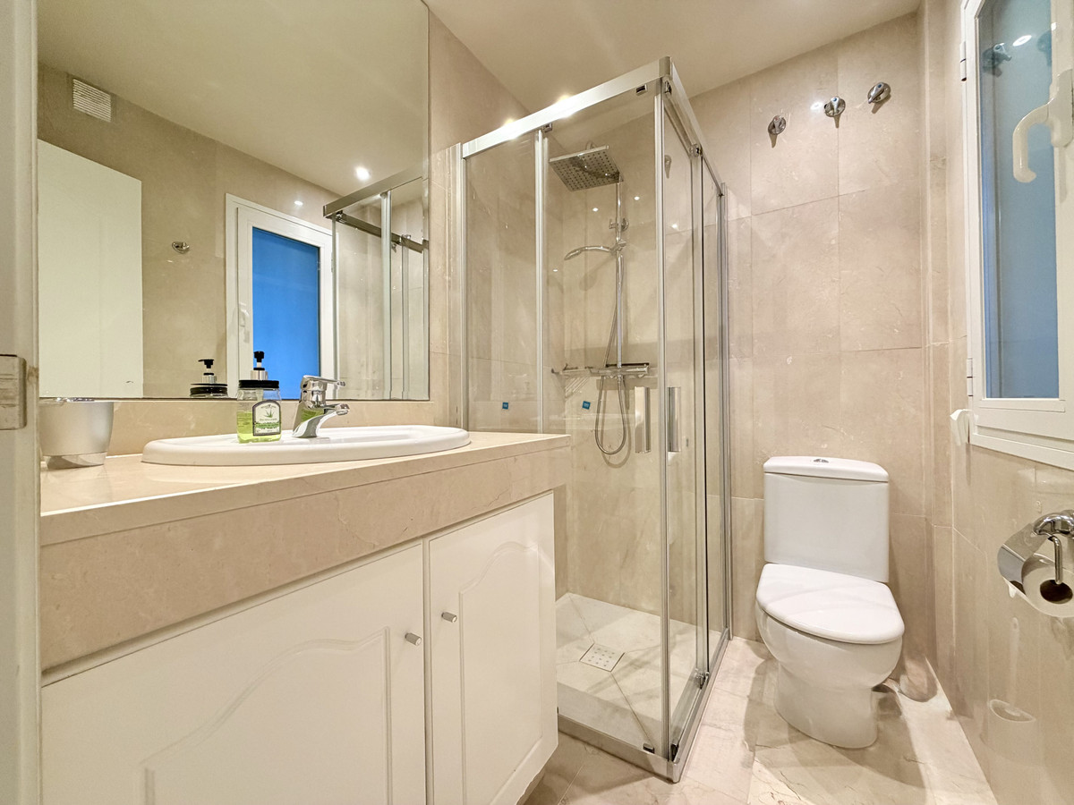 The property features a bright living-dining area opening onto an exceptional 100 m² private terrace, perfect for outdoor living by the sea. It offers two bedrooms and two bathrooms, presented in good condition with a comfortable and practical layout.