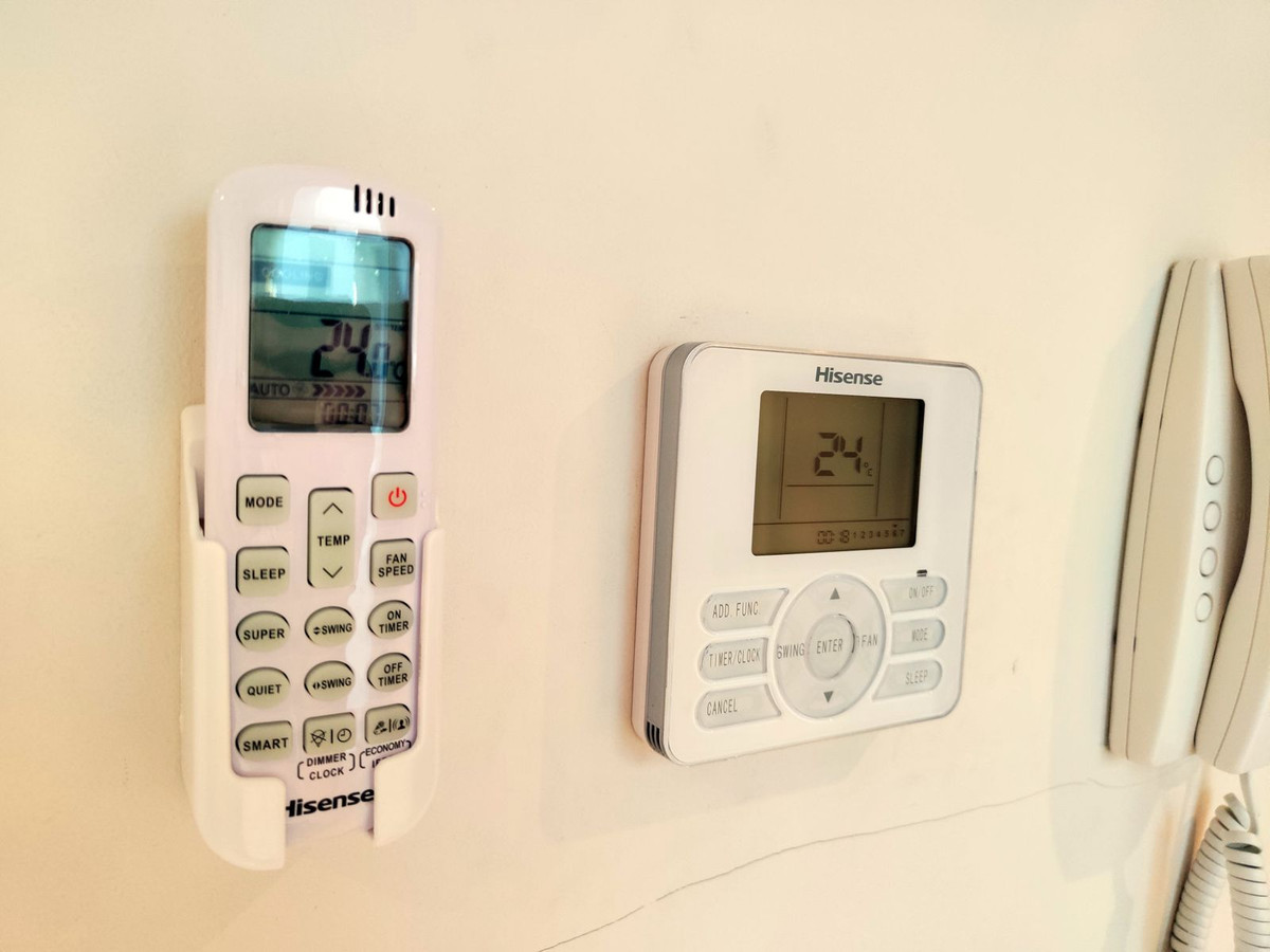 Accommodation for up to 4 guests is provided in a fully air-conditioned penthouse apartment with two double bedrooms, two bathrooms, a fully equipped kitchen with modern appliances, and a spacious living room. The 200 m² apartment includes a large terrace with views of the garden and surroundings.