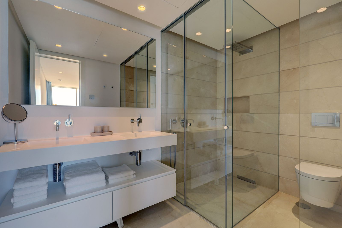 The apartment features two beautifully appointed bedrooms and two luxurious bathrooms, both equipped with walk-in showers and underfloor heating. The master suite is a private haven, enjoying direct access to the expansive terrace and complemented by an elegant en-suite bathroom. A second bedroom and guest bathroom provide equally refined accommodation for family or visitors.