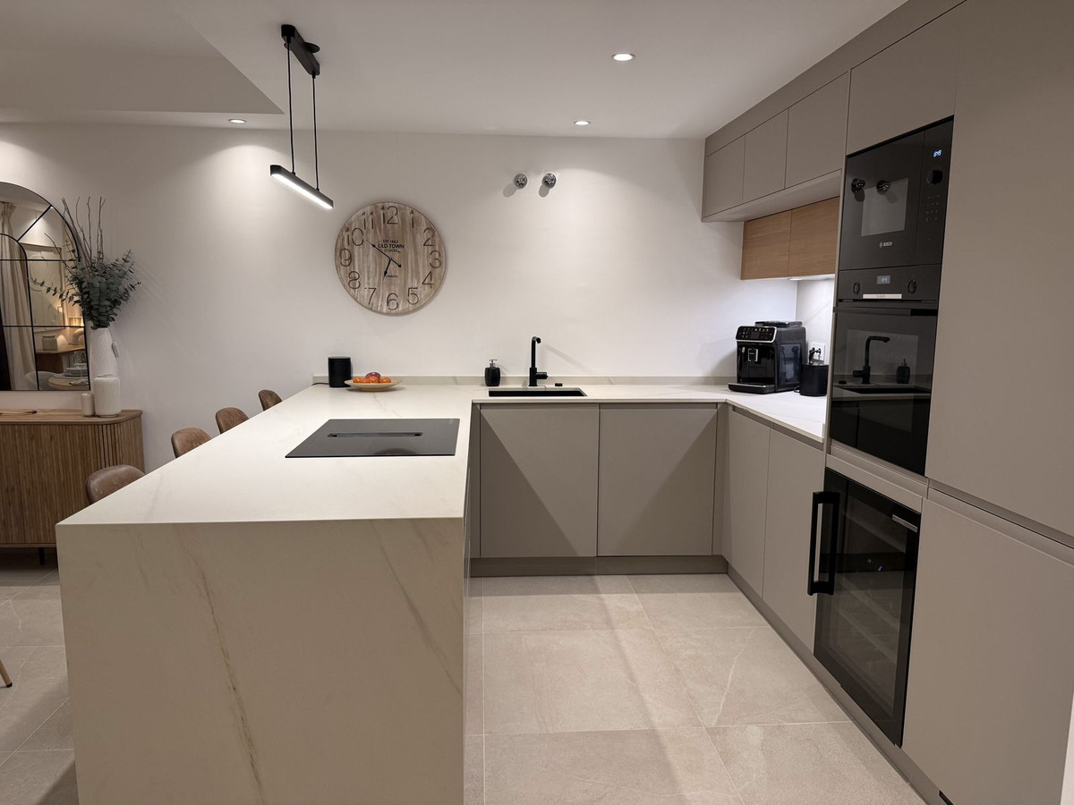 At the heart of the home lies the stunning open-plan kitchen, a true statement space designed for both everyday living and sophisticated entertaining. Finished with sleek cabinetry and equipped with top-of-the-range Bosch appliances—including oven, microwave, induction hob, and an impressive dual-temperature wine fridge—the kitchen combines functionality with indulgence. The innovative recirculating hob allows the cooking zone to be perfectly positioned on the peninsula, enhancing the social flow between kitchen, dining, and lounge areas.