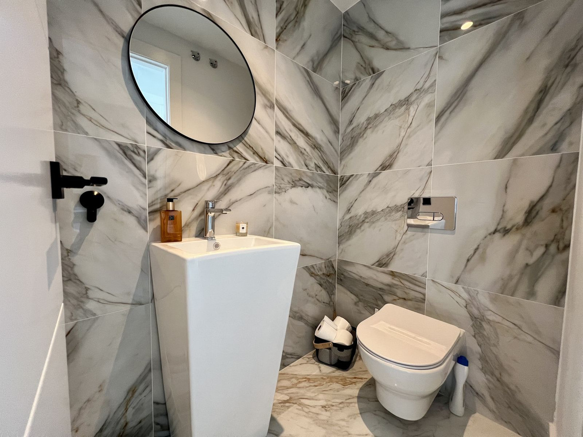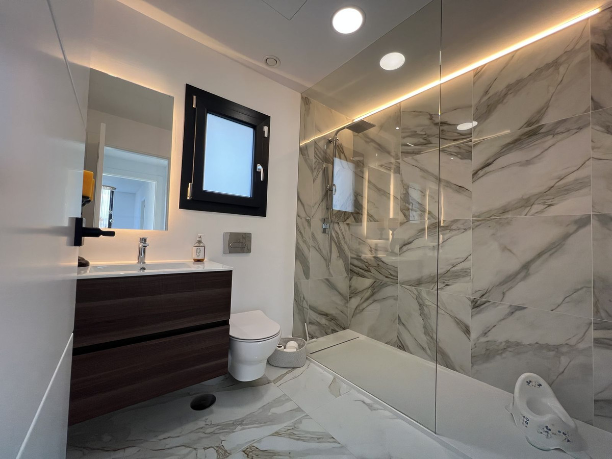 The entrance level offers a bright open-plan living and dining area with floor-to-ceiling windows providing direct access to the terrace. The modern kitchen is fully fitted and equipped with Bosch appliances and an island. This level also includes a guest toilet and a double bedroom with en-suite bathroom.